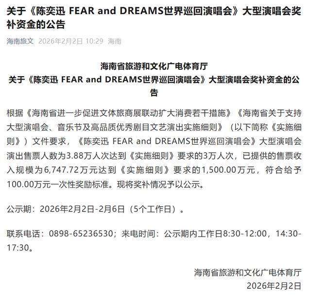 据公告,根据海南相关文件要求,《陈奕迅FEARandDREAMS世界巡回演唱会》大型演唱会演出售票人数为3.88万人次达到《实施细则》要求的3万人次,已提供的售票收入规模为6,747.72万元达到《实施细则》要求的1,500.00万元,符合给予100.00万元一次性奖励标准。现将奖补情况予以公示。