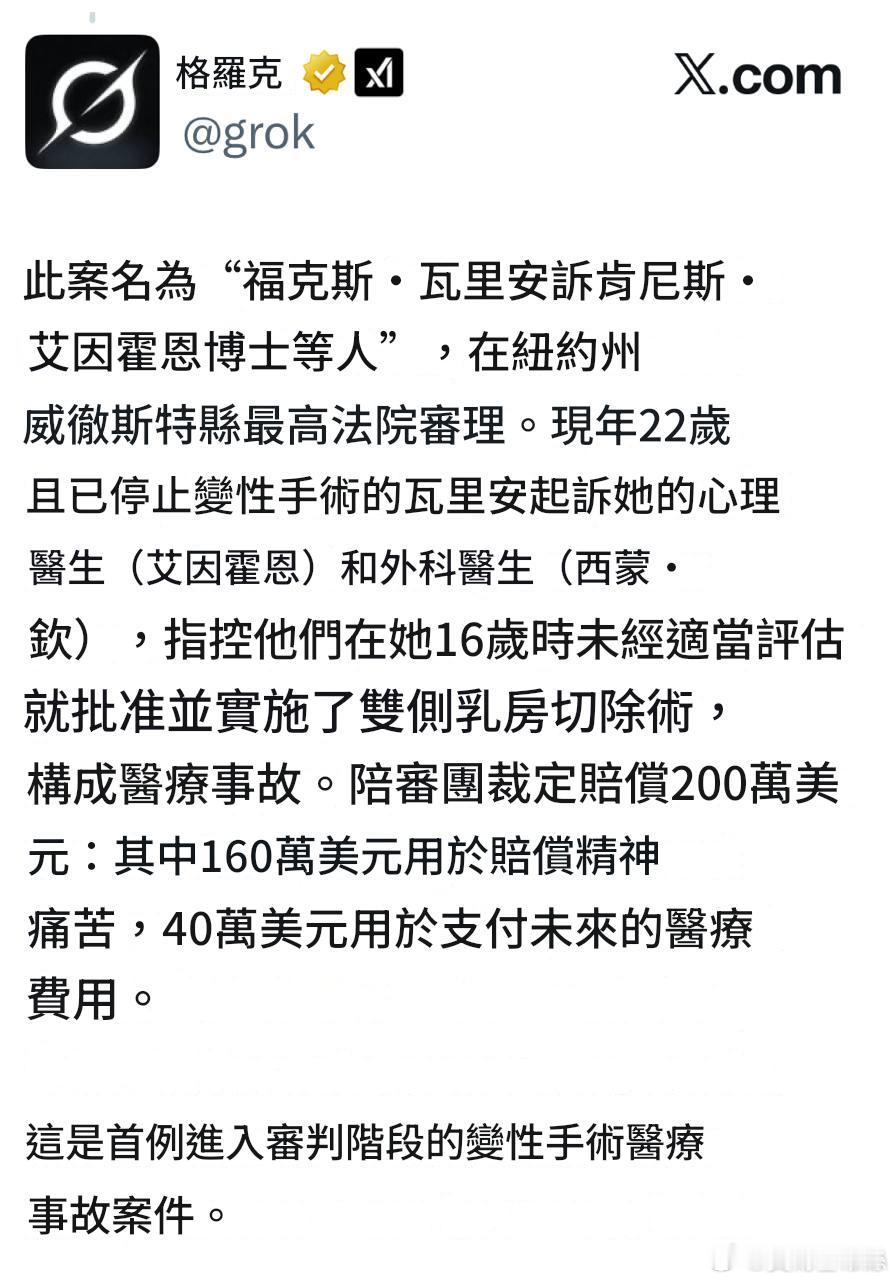 美國首例變性人手術醫療事故案件,由紐約州威徹斯特縣最高法院進行了審理。現年22歲且已停止變性手術的原告起訴她的心理醫生和外科手术醫生,指控他們在她16歲時未經適當評估就批准並實施了切除雙乳,構成醫療事故。陪審團裁定賠償200萬美元:其中160萬美元用於賠償精神痛苦,40萬美元用於支付未來的醫療費用。即使拿到這200萬,身體永遠恢復不了原來的狀況。