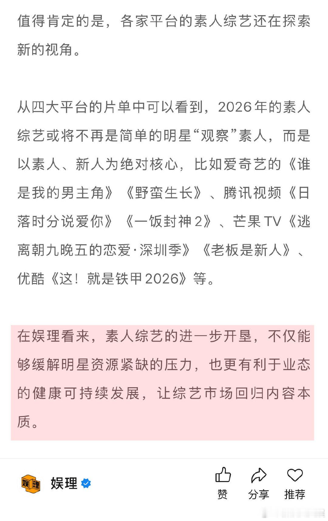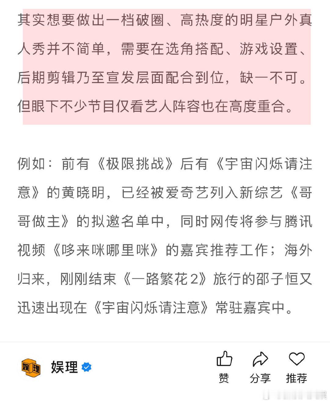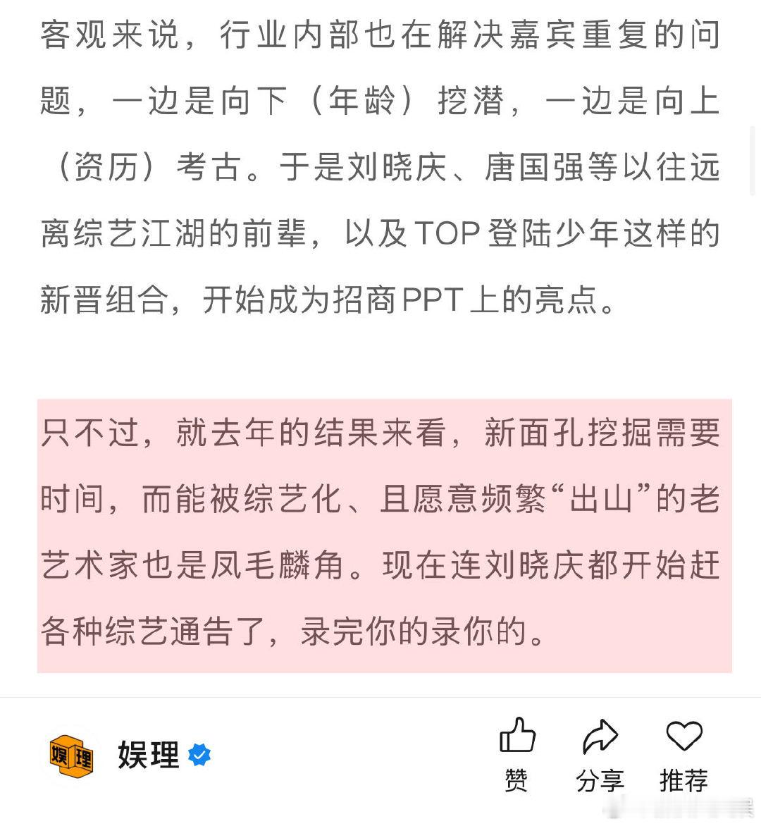 四大平台140档综艺靠谱吗 预算收紧明星真人秀为何仍被选择 面对明星资源紧缺,行业一手向下挖掘新生代,一手向上“考古”老前辈,刘晓庆、唐国强等少见于综艺的资深演员和TOP登陆少年等新晋组合,纷纷出现在招商PPT里。然而真正适合高频综艺、又愿意持续出镜的“可用之星”毕竟有限,远难以满足庞大片单的消耗… 娱理独家↓