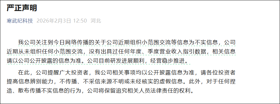 刚刚,寒武纪发布声明: