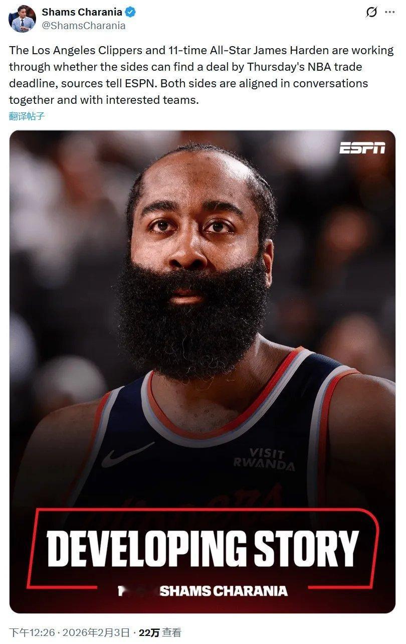 根据名记Chris Mannix报道称,快船队和骑士队正在就哈登和加兰的互换进行讨论,随后名记Shams证实了这则报道,名记Shams报道称,快船队与哈登都正在积极努力,完成哈登的换队交易,他们将力争在周四NBA交易截止日期前达成协议,双方都在积极与其他感兴趣的球队进行谈判。