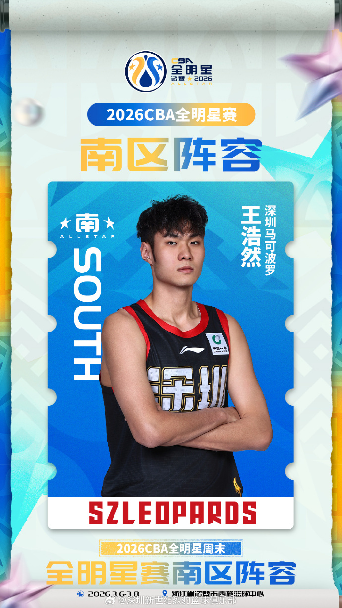 配文:恭喜王浩然入选CBA全明星南区阵容,将与贺希宁并肩出战全明星赛!