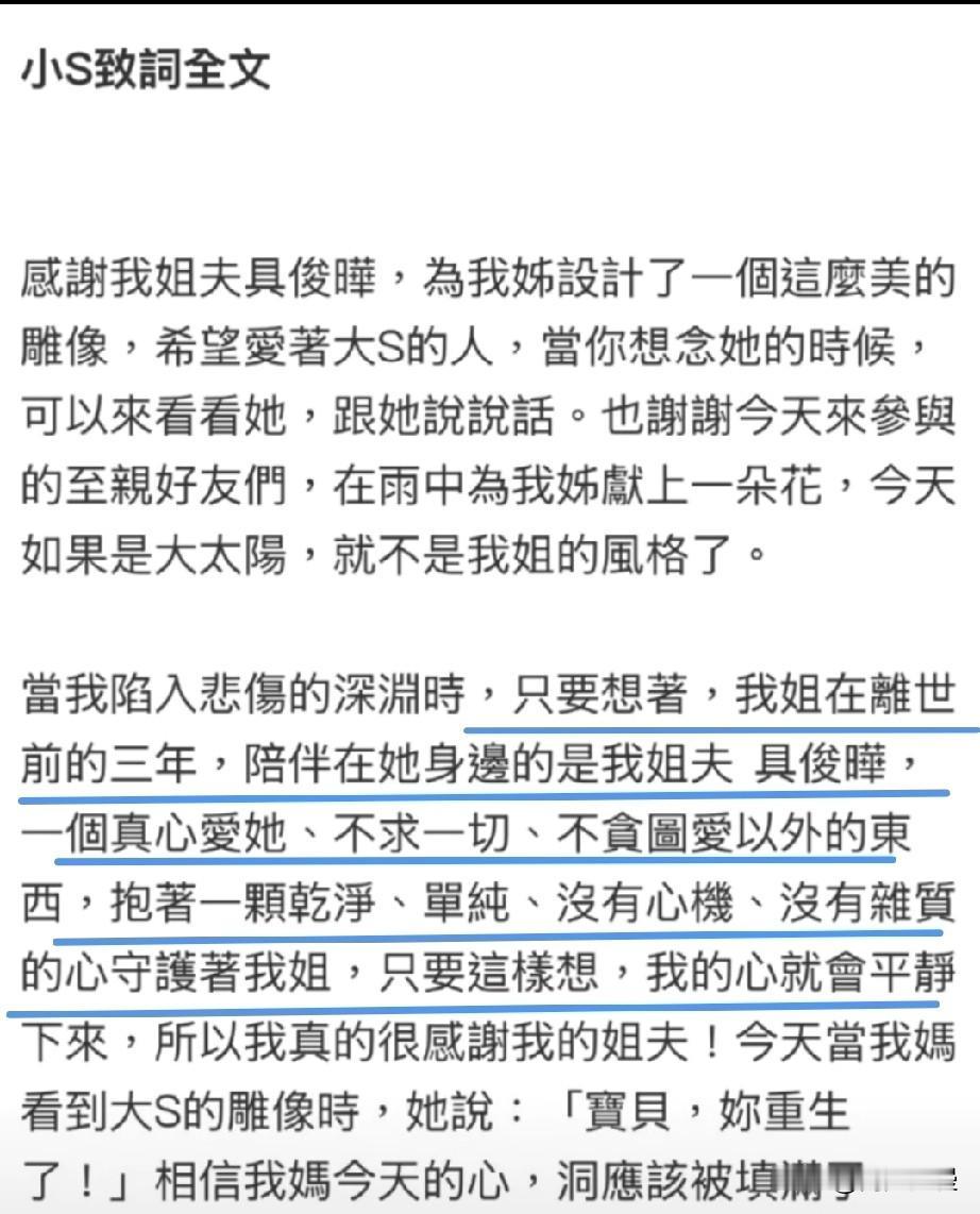 小S也不是什么省油的灯,在大S雕像仪式上直接把箭射向了汪小菲。 她的致词【如图二】先是感谢具俊为大S设计雕像,希望想念大S的人可以过来看看她还可以给她送花。 更是说到大S最后的三年是由具俊晔陪伴,还夸赞具俊晔不求回报很单纯,没有心机,不贪图爱以外的东西,一直爱着大S,并且在大S去世的这一年一直守着她,所以她特别感谢具俊晔。 大S的亲朋好友怀念她的方式也很特殊,昨天的雕像仪式上,小S带头与姐妹淘在墓地上为大S唱歌,一群人又哭又笑,不走寻常路。 最后可惜的是大S的两个儿女前后都没有出现,这对于孩子来说挺遗憾的,长大以后不知道孩子会不会介意外婆家的亲戚。 最后想说的是,汪小菲已经和大S离婚,并且大S已经二婚了,有具俊晔陪伴很正常,两家看来很难和解了!大s人生 谢幕 人到中年,什么是最重要