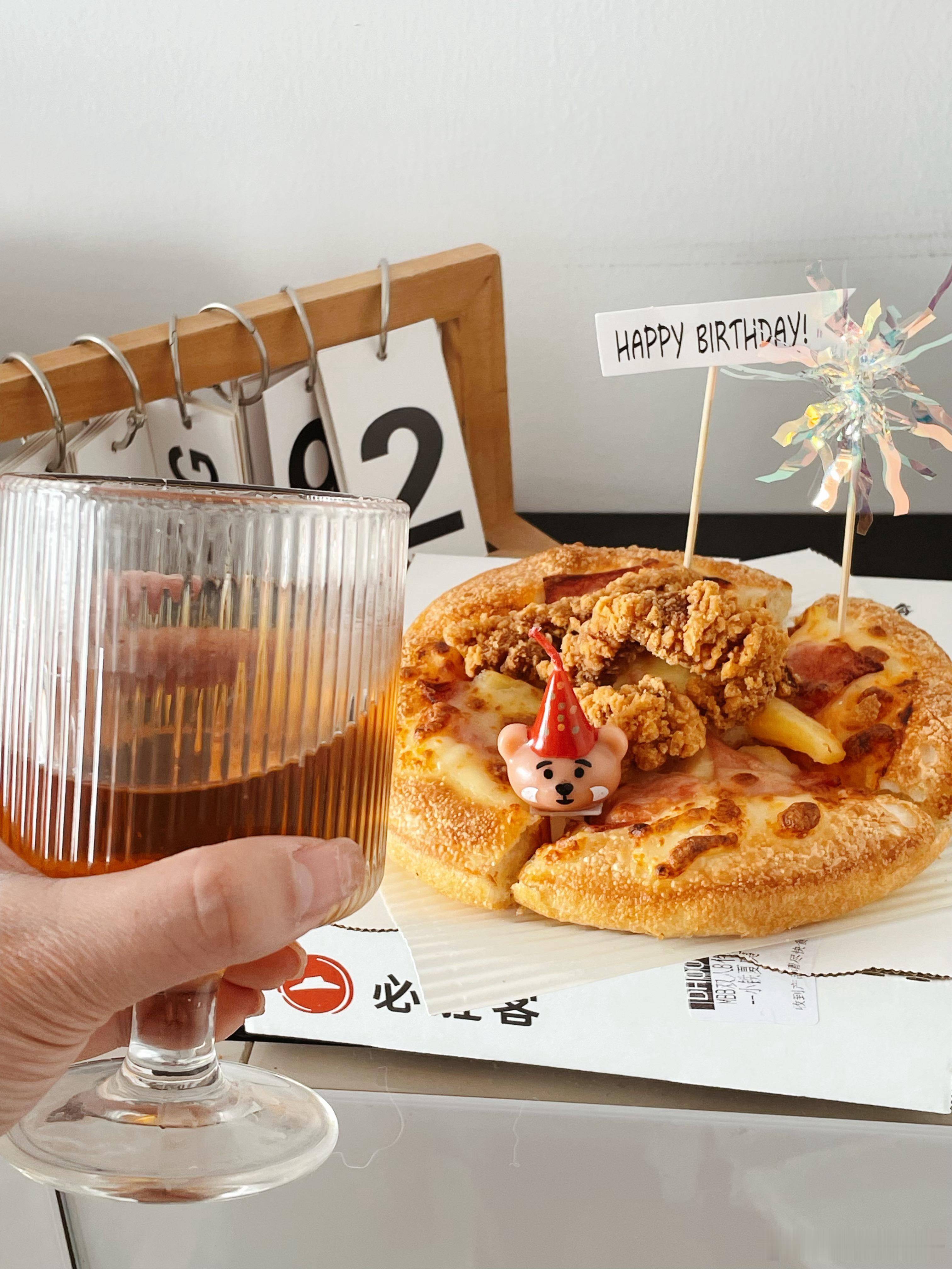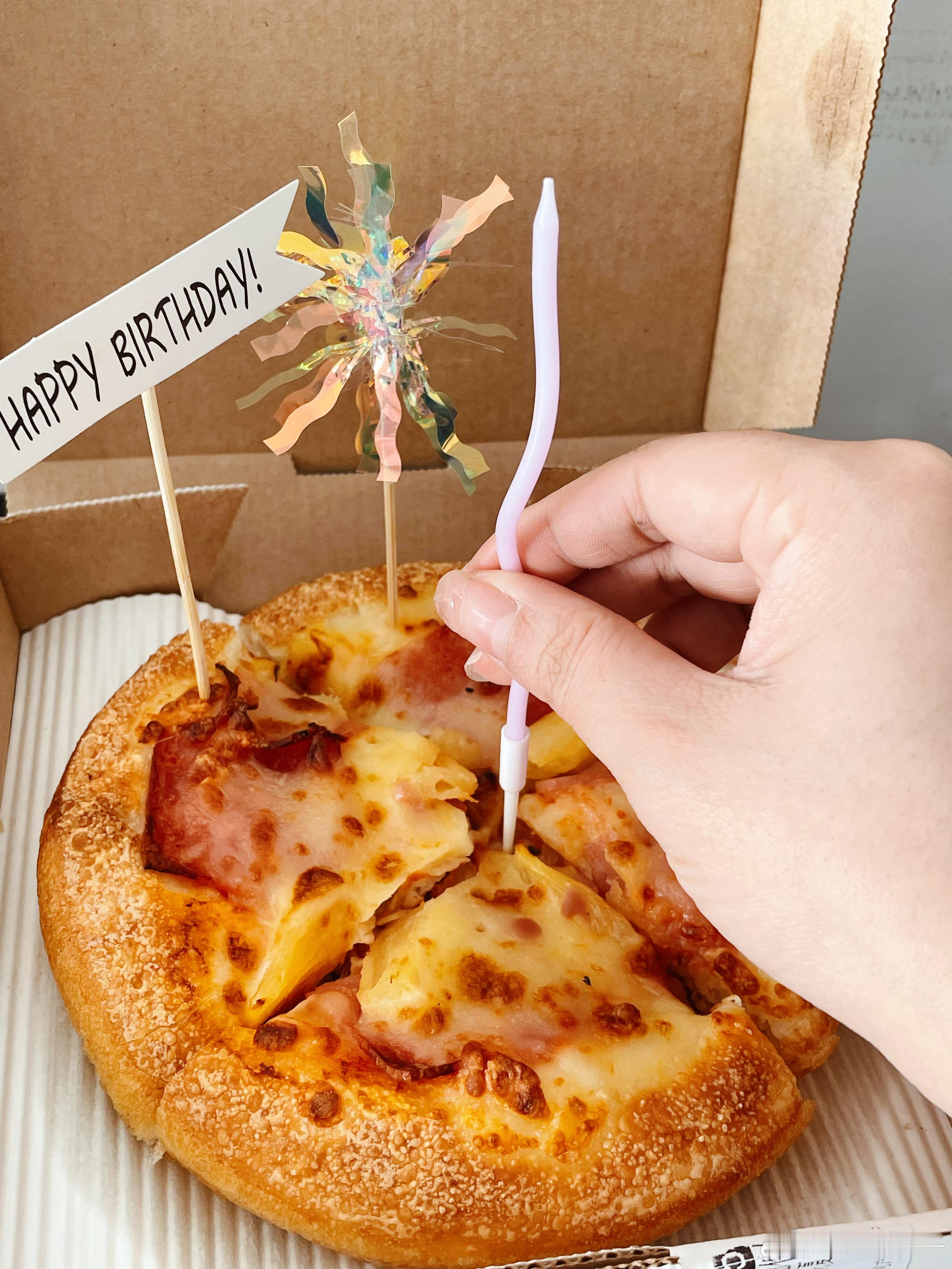 用披萨蛋糕打开我新的一岁如果你看到有人在生日期间,只买了一个披萨,请不要同情她,因为她甜食不耐受
