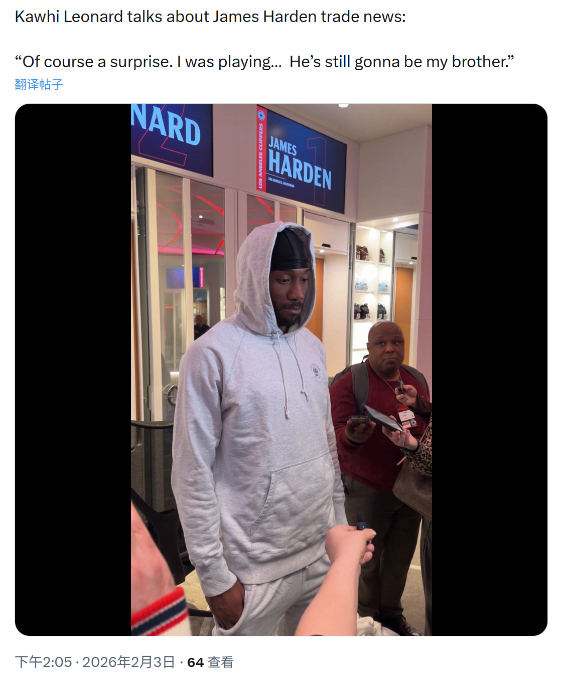 伦纳德谈哈登的交易流言:“确实有点意外,当时我还在比赛,他依然是我的兄弟,无论是