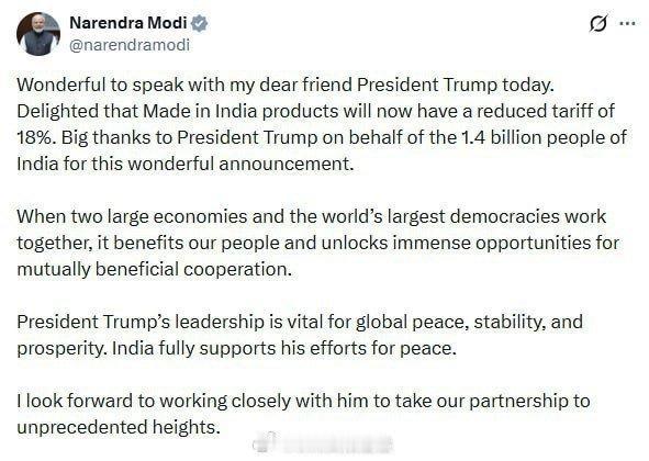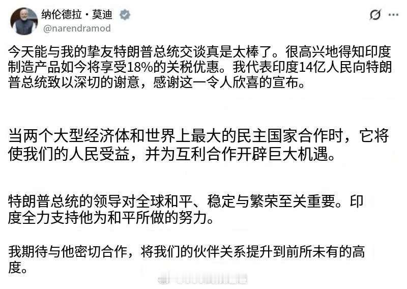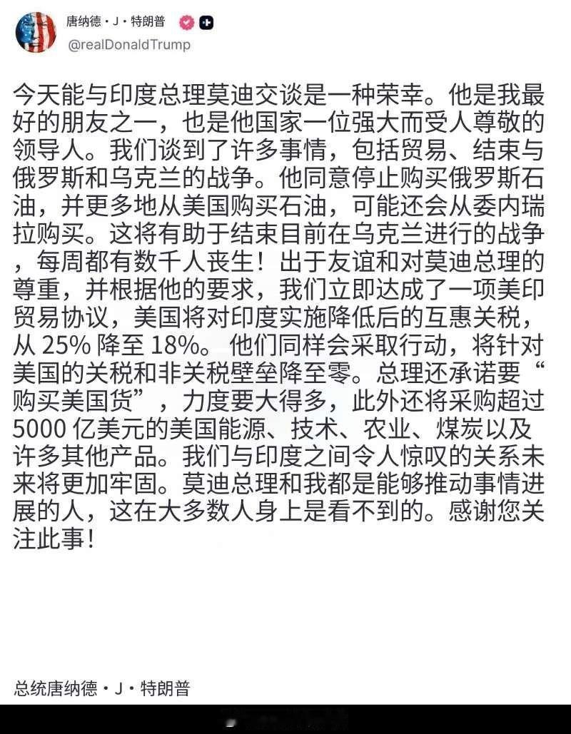 阿川宣布:美国和印度达成贸易协议,莫迪同意停止购买俄油,改从美国和委内瑞拉进口石油 根据该协议,美国对印基础关税从25%降至18%。印度则对美国的关税和非关税壁垒降至零。印度购买5000亿美元美国产品 就在特朗普宣布印度放弃俄罗斯石油,双方互降关税后,莫迪也发文谈到了美国将降低关税,但对于放弃俄罗斯石油一事只字未提,相互之间还不忘互相吹捧,都称呼对方是好朋友,莫迪说特朗普是我“亲爱的朋友”,特朗普说莫迪是“最亲密的朋友之一”。 可是要莫迪答应不买俄罗斯石油?我觉得这事不可能最多是敷衍,印度能这么干才有鬼了,因为 1,俄罗斯石油有很大折扣,印度不买不就亏了。 2,俄罗斯石油也适合印度炼油厂,换其他油成本会增加。 3,俄罗斯和印度有传统友谊,印度不能这样背后一刀。 4,美国说不买就不买了,印度也是有国家尊严的。 对此,你怎么看?