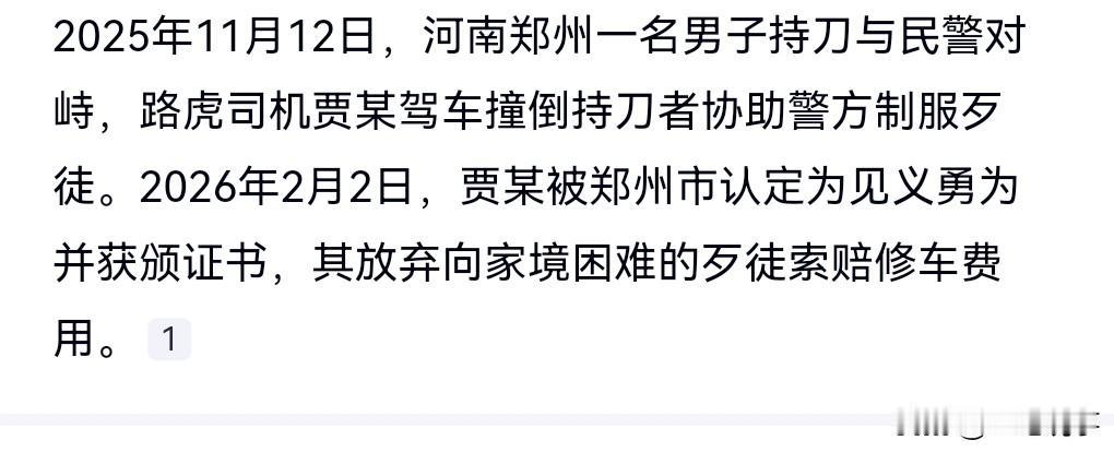 没毛病,那这必须是妥妥的见义勇为。 2025年11月12日,河南郑州,路虎司机撞倒持刀歹徒, 这歹徒当时也是挺疯狂的,竟然敢和警察对峙,这简直是在找死。 路虎车司机见到后当车撞歹徒,成功的扭转了乾坤。 这是一个见义勇为的行为。 2026年2月2日,路虎司机撞倒持刀歹徒被认定见义勇为。 司机放弃向被撞的人索赔修车费用,因为歹徒家庭困难。 毕竟开路虎的也不差钱。