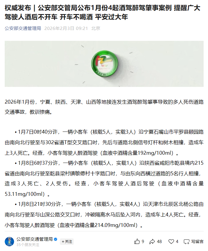 权威发布|公安部交管局公布1月份4起酒驾醉驾肇事案例提醒广大驾驶人酒后不开车开车不喝酒平安过大年
