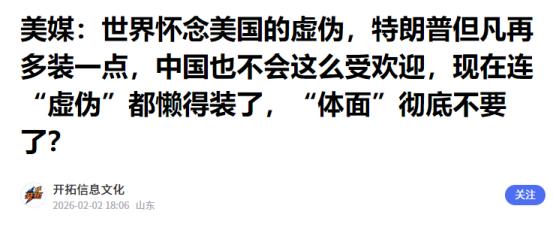 美媒:世界怀念美国的虚伪,特朗普但凡肯装,中国不会这么受欢迎 《外交事务》这篇文章堪称美国战略界的 “集体诉苦”,字里行间全是 “今非昔比” 的怅然。文章作者是美国前国务院顾问,通篇没绕弯子:冷战后美西方能主导世界,靠的不是真公平正义,而是 “精致的虚伪”,把霸权包装成 “民主灯塔”。 把干涉别国内政说成 “推广自由”,把经济掠夺打扮成 “全球化红利”。这套 “装腔作势” 玩了几十年,居然真让不少国家买账,毕竟表面上的规则总比赤裸裸的霸凌强。 文章里举了个扎心的例子:2003 年美国打伊拉克,拿一管 “洗衣粉” 当大规模杀伤性武器证据,却打着 “解放伊拉克人民” 的旗号,当时欧洲盟友跟着附和,不少发展中国家敢怒不敢言。 放到现在看,这就是典型的 “虚伪操作”,先立道德牌坊,再干霸权勾当。但文章居然说,这种 “虚伪” 其实是 “必要的润滑剂”,至少能维持国际秩序的表面平和。言外之意就是:我们以前装得好,世界才服我们;现在不装了,大家反而不认账了。 更有意思的是,文章把中国的受欢迎归因为 “特朗普不装了”。说特朗普上台后,把 “美国优先” 四个字刻在脑门上,退出巴黎协定、撕毁伊核协议、搞贸易战,连盟友都照坑不误,完全抛弃了美西方坚持几十年的 “虚伪话术”。 以前美国搞制裁还会找个 “人权问题” 的借口,特朗普直接明说 “就是为了美国利益”;以前西方干涉他国内政还会拉上联合国背书,现在特朗普干脆自己搞个 “和平委员会”。 10 亿美元就能买永久席位,把国际组织变成 “付费俱乐部”。这种 “赤裸的霸权” 让世界各国傻了眼,反而开始怀念以前那个 “肯装一装” 的美国,至少那时还有表面规则可依。 《外交事务》这篇文章的荒诞之处在于,把 “世界怀念美西方的虚伪” 当成了客观事实,却没看清真相:世界怀念的不是 “虚伪” 本身,而是 “虚伪” 背后那层看似稳定的秩序;而反感的也不是 “真实”,而是特朗普那种 “赤裸的霸权”。美西方把自己的衰落归咎于 “演技退步”,却没意识到,霸权本身就是问题的根源。 美西方的 “虚伪” 其实早就漏洞百出。2003 年伊拉克战争的谎言、2018 年叙利亚 “白头盔” 组织的摆拍、美国德特里克堡基地的生物实验室疑云、对中国企业的无端制裁,这些事实早就戳破了 “民主灯塔” 的假象。特朗普的 “不装”,只是让这些假象加速暴露而已。 就像一个穿西装的抢劫犯,以前还会说 “我是为你好”,现在直接抢了就跑,受害者当然会怀念以前那个 “至少还会装一下” 的抢劫犯,但这绝不代表抢劫犯是对的。 而中国的崛起,恰恰是因为我们打破了 “霸权 = 秩序” 的逻辑。中国倡导的多边主义,不是美西方那种 “小圈子” 的伪多边,而是真正的主权平等、协商一致;中国推动的国际合作,不是 “资本换权力” 的交易,而是互利共赢的伙伴关系。 比如 RCEP 的签署,让亚太地区形成了全球最大的自由贸易区,没有哪个国家被强迫加入,也没有哪个国家被区别对待;在气候变化问题上,中国兑现碳达峰、碳中和承诺,积极帮助发展中国家应对气候变化,这比美西方 “说一套做一套” 的虚伪靠谱多了。 文章最后还酸溜溜地说,“如果特朗普肯装一装,中国不会这么受欢迎”。这话其实暴露了美西方的傲慢:他们始终觉得,世界各国只能在 “虚伪的霸权” 和 “赤裸的霸权” 之间二选一,却没意识到,各国真正想要的是 “平等的尊重” 和 “真实的合作”。 中国的受欢迎,不是靠别人 “让” 出来的,而是靠自己实打实的行动赢来的。美西方与其怀念过去的 “虚伪”,不如好好反思一下:为什么当你们不装了,世界反而选择了中国? 说到底,《世界会怀念美西方的虚伪》这篇文章,不过是美国战略界的 “精神胜利法”。他们不敢承认霸权衰落的必然,只能把原因归咎于 “演技不行”。 但历史早就证明,虚伪的面具终会被揭穿,霸权的逻辑终将被抛弃。中国的受欢迎,不是因为特朗普 “不装了”,而是因为时代变了,世界需要的是真诚的合作,而不是伪装的霸权;需要的是平等的伙伴,而不是霸道的霸主。