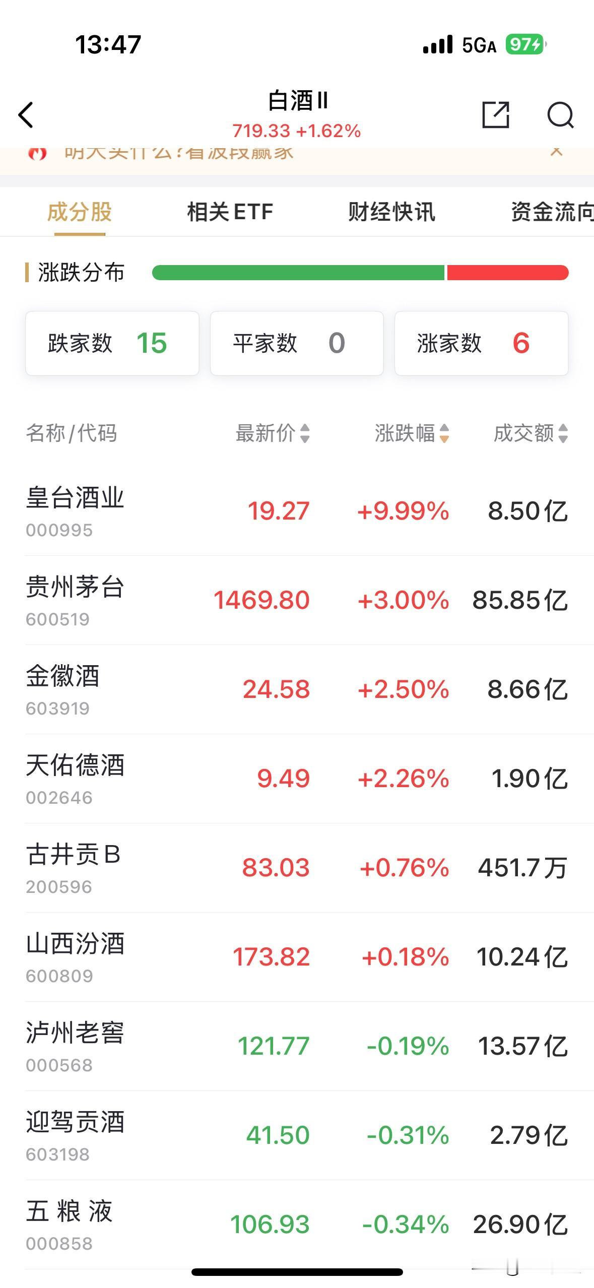 茅台一枝独秀,涨幅超过3%,带动白酒板块上涨1.6%,但板块效应较差,仅6只白酒股上涨,除皇台酒业涨停外,涨幅排名第二。 看来在某大拿增持带动下,加上公司主动提高市占率,挤压其他高端白酒市场份额。 茅台酒的味道已经真的很香,愈沉愈香。 乐呀财经