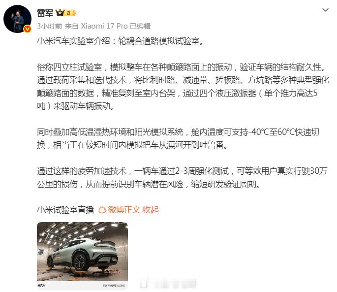 前几天雷总直播谈了不少东西,其中一个就是关于小米汽车轮耦合道路模拟试验室,这个试验的名字很高级很专业,但是其实不难理解。