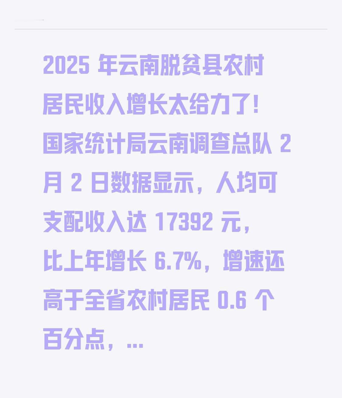 2025 年云南脱贫县农村居民收入增长太给力了!国家统计局云南调查总队 2 月 2 日数据显示,人均可支配收入达 17392 元,比上年增长 6.7%,增速还高于全省农村居民 0.6 个百分点,和全省的差距进一步缩小。 各项收入都在涨,转移净收入 4281 元,增长 12.2%;工资性收入 6475 元,增长 5.3%;经营净收入 6486 元,增长 4.5%。 这背后是云南各地推进脱贫攻坚和乡村振兴衔接,聚焦产业发展和稳岗就业,像乡村旅游发展、高原特色农业提质增效,让大家的钱包更鼓了。 农村人收入 城乡收入比 云南GDP 云南经济 脱贫 月人均收入 农村脱贫户