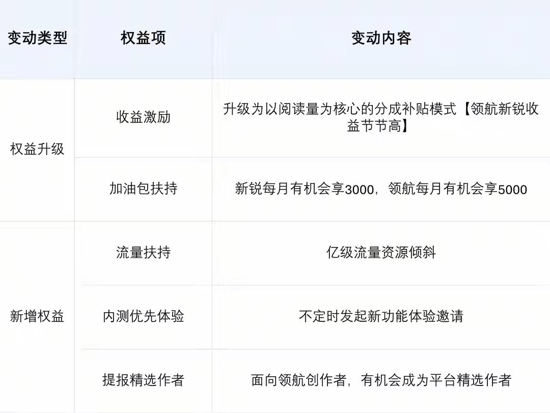 新锐创作者的好日子要来了吗[笑哭]? 昨天我偶然发现头条号发文说,今日头条平台要对新锐创作者、领航创作者进行标准更为合理、力度更为扩大的激励计划。细细读来,发现今日头条的激励计划确实更为合理了。 比如之前的标准是每周的发文数目大于前一周才会有奖励,这就让创作者很不好把握,因为很多作者自己很难知晓本周自己到底创作了多少篇,是否超过了上周,所以这激励措施其实是形同虚设。 而现在是以阅读量为核心,根据当周新发文的累计阅读量分档进行奖励,每周阅读量在500-3万,奖励2元,在3万-10万,奖励30元,阅读量≥10万,基础分成翻倍(最高100元)。 我相信,不日将可以看到,今日头条注重发文质量和传播效果的英明措施将会为创作者个人带来更多收益,也会实现今日头条这个平台的持续辉煌!