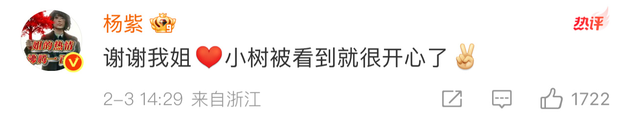 :“听紫说过,所以知道这部戏拍的时候有多难,多辛苦。”:“谢谢我姐,小树被看到就很开心了。”