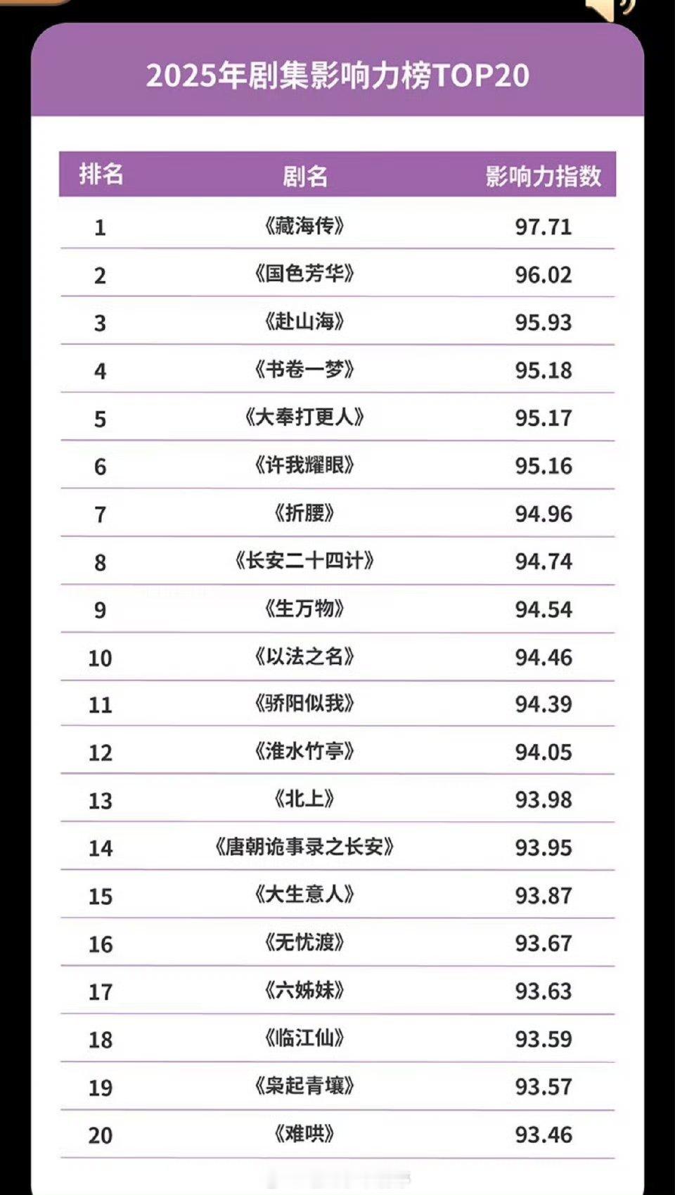 剧集影响力板块上榜的有: