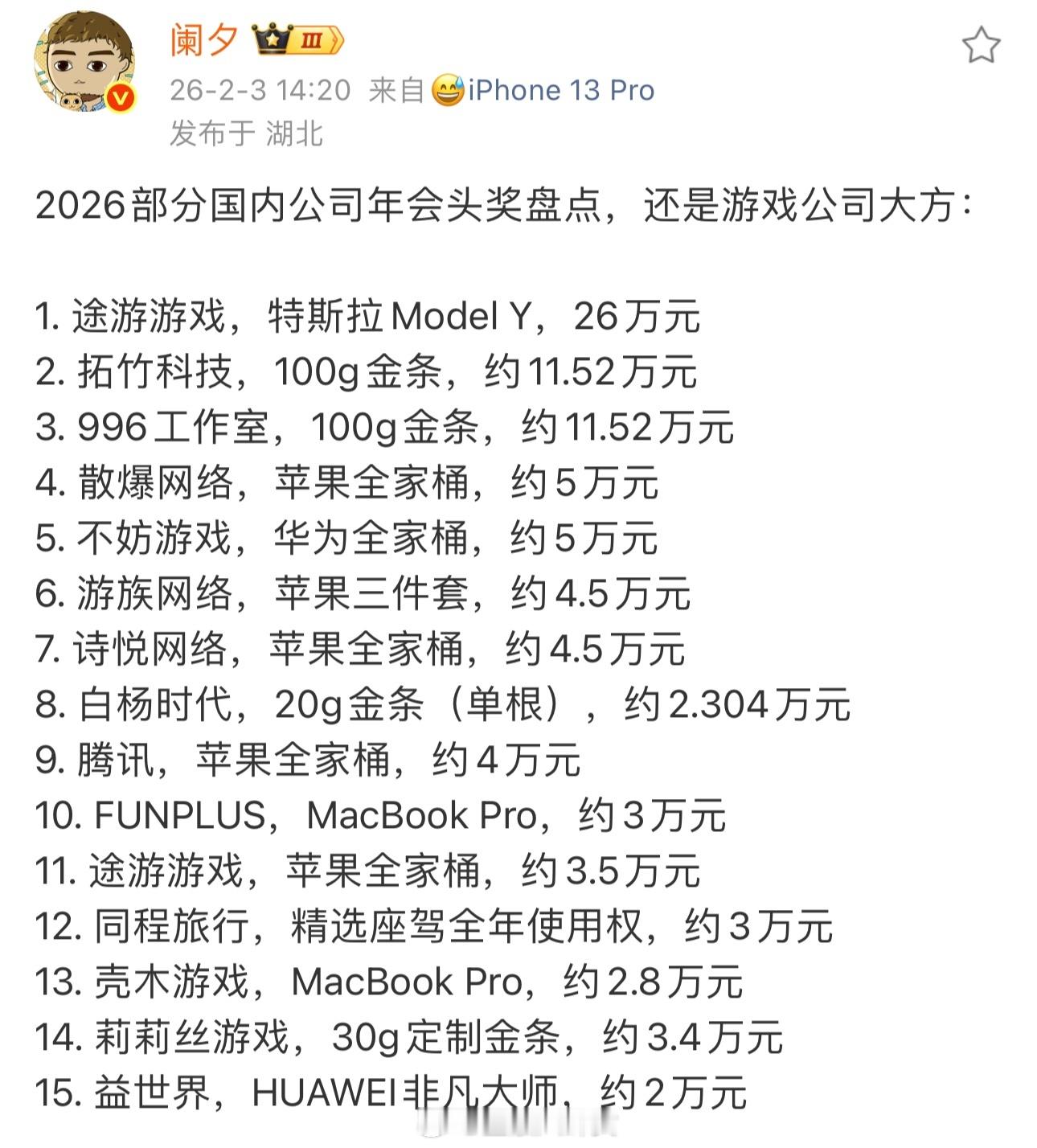 2026部分国内公司年会头奖盘点