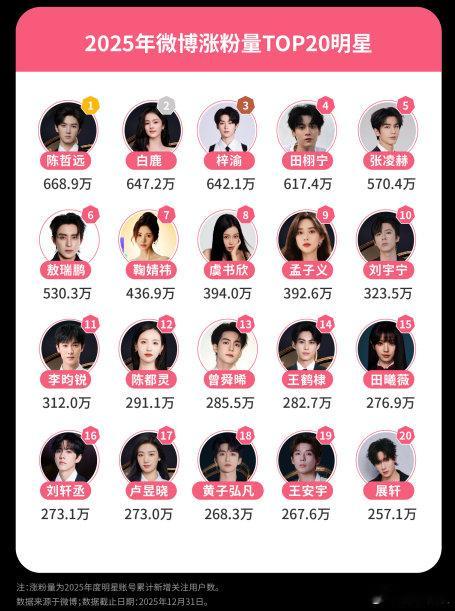 陈哲远2025微博涨粉量TOP12025微博涨粉量TOP10明星 2025微博娱乐白皮书 揭晓,陈哲远、白鹿、梓渝、田栩宁、张凌赫、敖瑞鹏、鞠婧祎、虞书欣、孟子义、刘宇宁入围TOP10,为你喜欢的Ta打call。