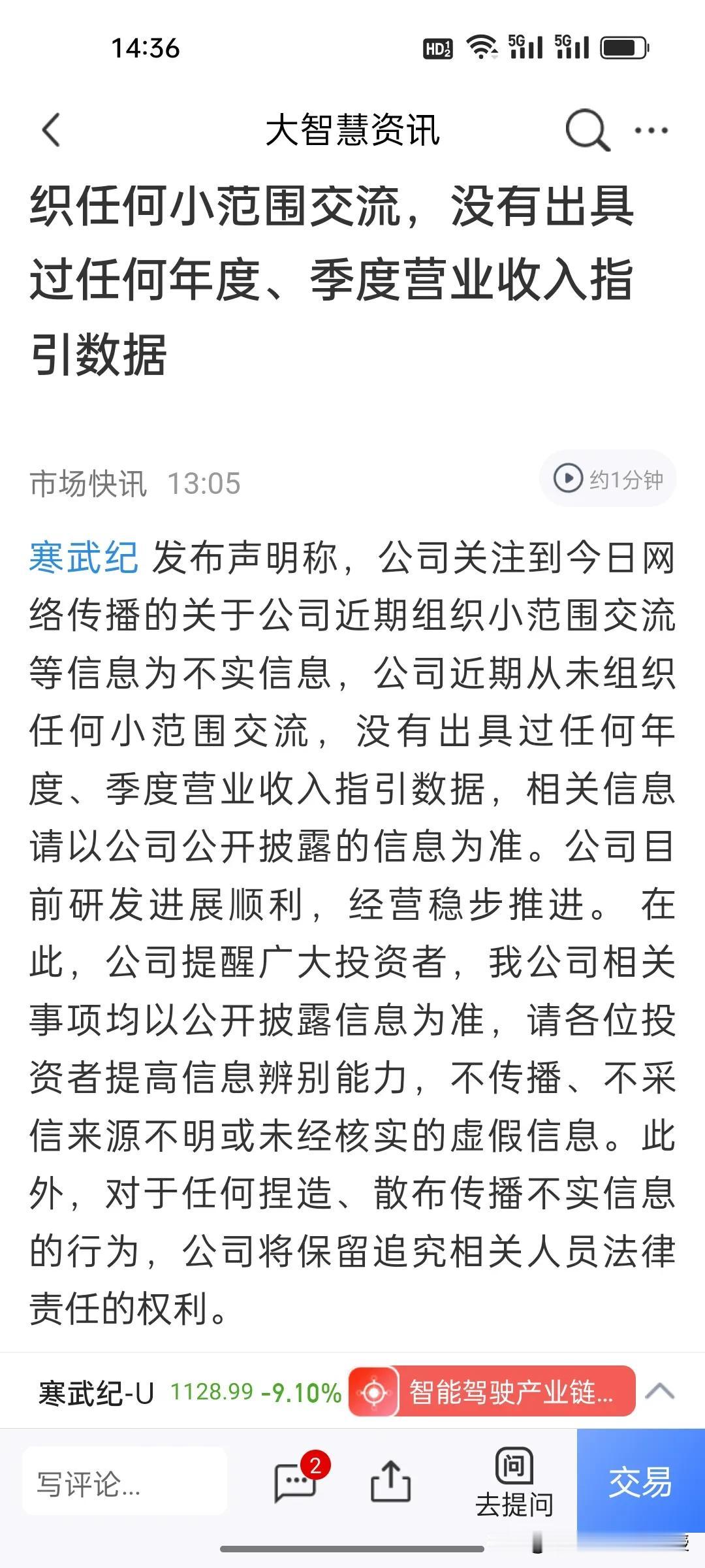 寒武纪暴跌10%!小作文竟成砸盘元凶? 寒武纪突遭闪崩跌超10%,陈天石怕是直呼冤枉!天下苦小作文久矣,没想到这次竟然轮到了“寒王”。 网上一则小作文称寒武纪2026年营收仅200亿远低预期,理由竟是H200芯片将冲击国产算力,机构疯传散户跟风砸盘,公司午间紧急辟谣:从未组织交流、未发布任何业绩数据!当前黄仁勋都说没接到任何一笔H200的大陆订单。不知道这篇小作文是什么机构所为。 要知道寒武纪2025年预盈18.5-21.5亿,营收暴增超4倍,且国内65%国企算力中心是国产基本盘,就算H200进来,也根本撼不动格局。 现在寒武纪市值4700亿,仍跌9%,网友说就算没有小作文作祟,那估值也是过高的,跌了只是估值回归。 现在虽然监管机构在整治扰乱市场的小作文,但是仍然会有这些搅动市场的因素时不时发生。市场岂能被谣言牵着走,国产算力的底气,从来不是一篇小作文就能否定的!