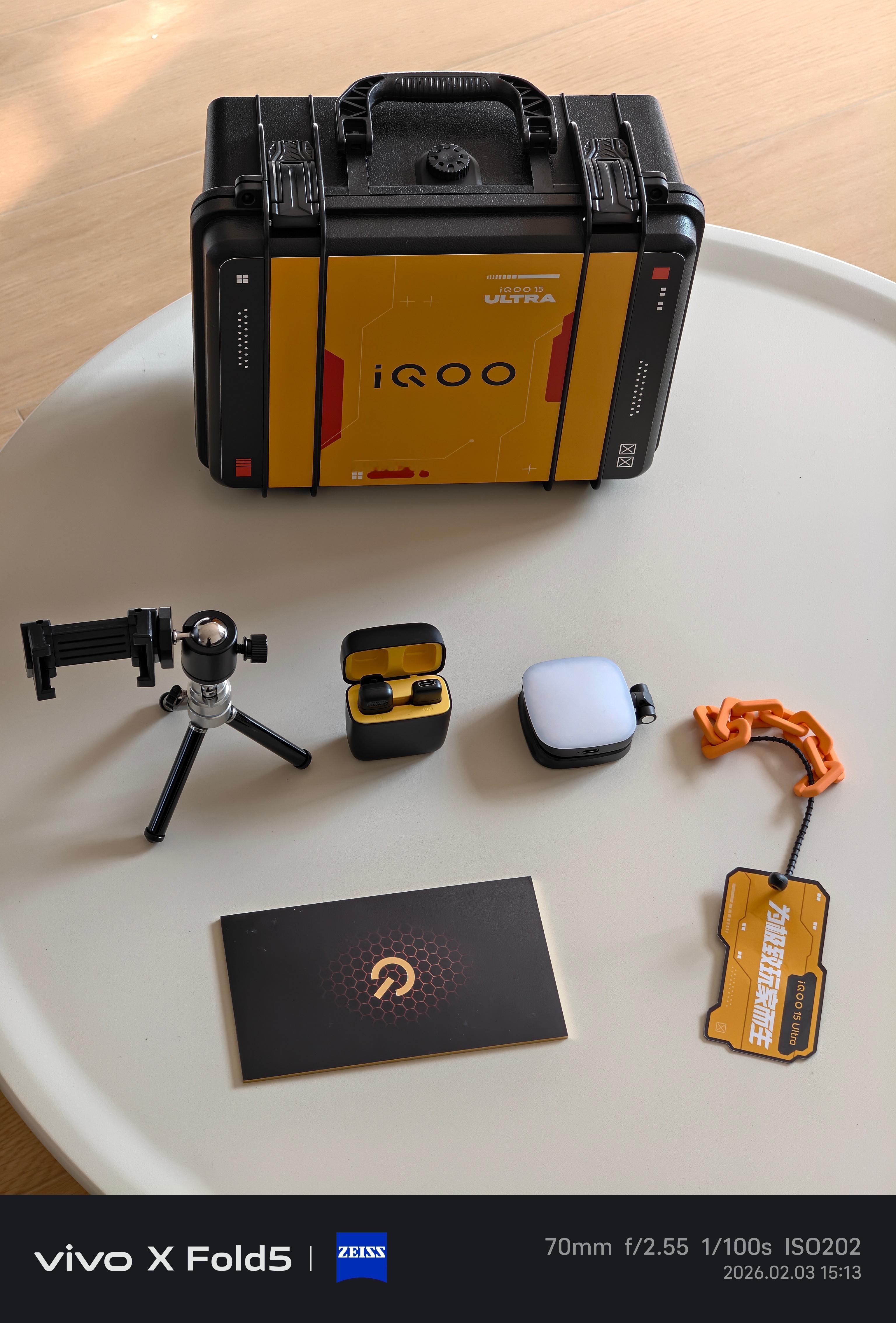 iQOO 15 Ultra邀请函太顶了,是一套直播套装。脚架、无线麦克风、补光灯