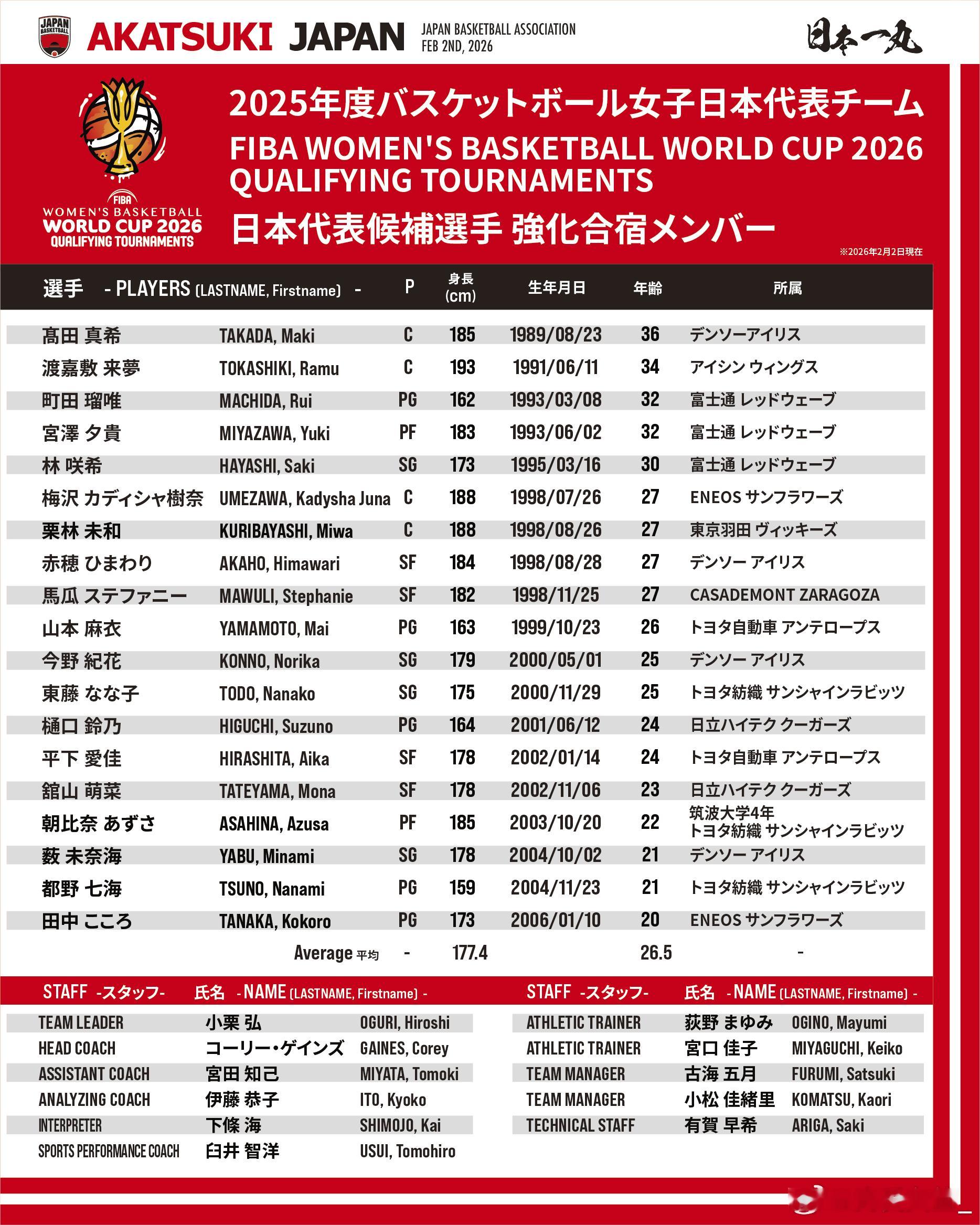 【高田真希、田中心领衔 山本麻衣、町田瑠唯回归日本女篮集训名单】近日,日本篮协宣布,为备战2026年3月11日在土耳其伊斯坦布尔举办的“2026 年国际篮联女子篮球世界杯预选赛”,将于2月20日起开展强化集训,并公布了参加集训的19名运动员名单。此次名单中,有11名球员参加过世界杯或亚洲杯,除了此前在亚洲杯表现亮眼的新星田中心,高田真希、宫泽夕贵、渡嘉敷来梦和马乌里等上届世界杯和亚洲杯的主力球员也都悉数入选。此外没有参加上届亚洲杯的山本麻衣和町田瑠唯也在此次集训中回归了国家队。这支集训队伍的平均年龄为26.5岁,年龄最大的高田真希和年龄最小的田中心相差了16岁之多。女篮世界杯