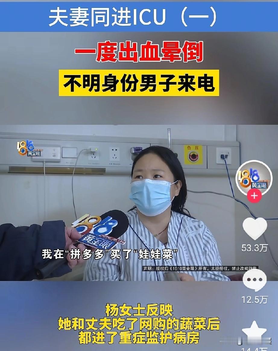 难以置信,在菜里下毒的竟然是他丈夫!是自己的枕边人! 前几天,浙江台州一对夫妻从网上买了一些娃娃菜,没想到第二天吃的时候竟然中毒了,之后两人都被送到了医院ICU进行抢救,原因是菜里有老鼠药,属于老鼠药中毒! 后来记者去医院采访他们,中毒的杨女士描述了一下整个过程,说当时菜是他丈夫清洗的,用清水冲洗了两遍! 然后记者又问他丈夫,其实当时他丈夫的眼神和口气已经出卖了他,只是大家没有注意,他丈夫在回答记者的时候眼睛一直在动,似乎有意躲避镜头,说话有点犹豫结巴,感觉像是在撒谎! 这里面还有一个关键点,就是他们家小孩当天不在家,他的丈夫吃的比较少,中毒比较浅,比妻子杨女士提前出院! 可以说,他丈夫这一招苦肉计玩的比较高明,自己也吃这些菜,让自己也中毒从而转移注意力,让大家一致认为是娃娃菜有问题,把矛头对准商家。吃的过程中让妻子多吃,自己少吃,从而达到自己的目的! 目前,他丈夫已经被采取措施,至于为什么要投毒正在调查中! 欢迎大家一起留言讨论!