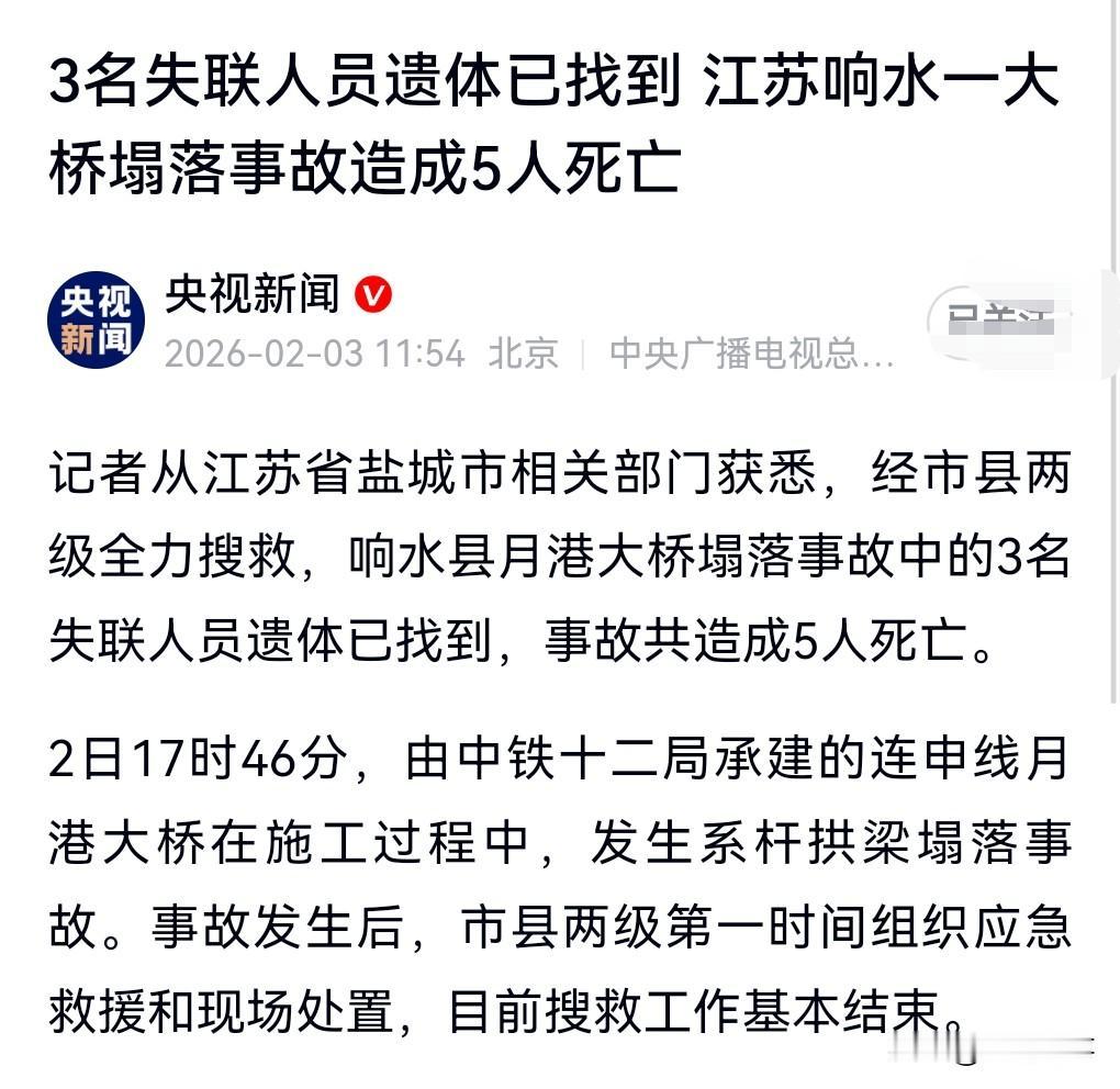 这真是太悲剧了。 2月2日,江苏响水一大桥塌落事故致5死。 施工过程中发生这样的悲剧,这感觉很不专业。 这真的不应该出现啊。 这可是五条人命啊。 而且就快过年了,发生这样的事,多让家属悲痛啊。 这应该要做出巨额赔偿吧。