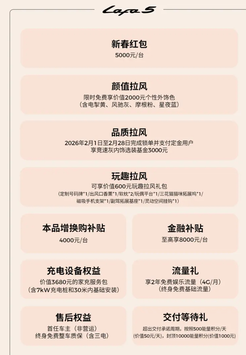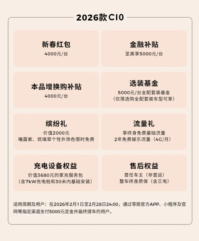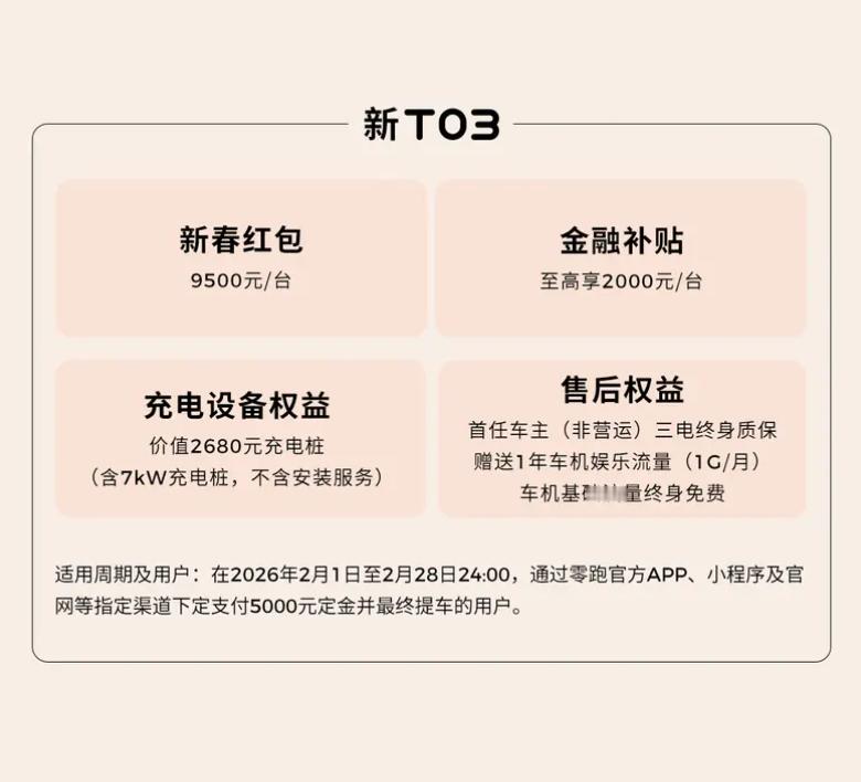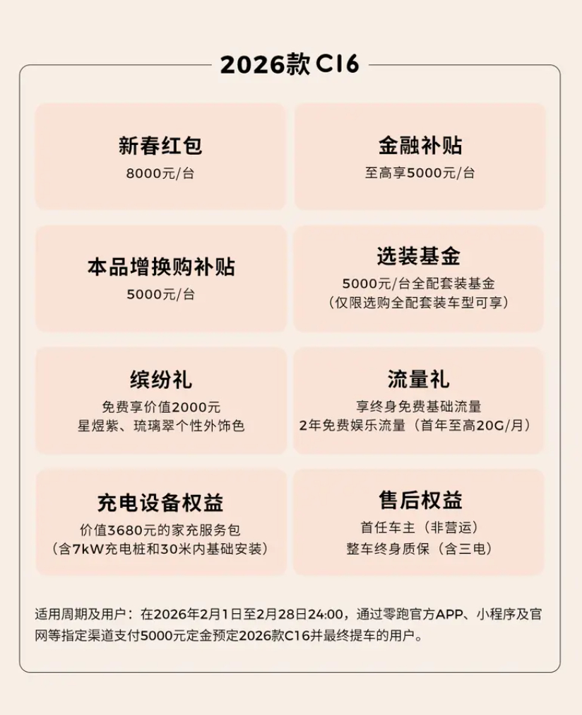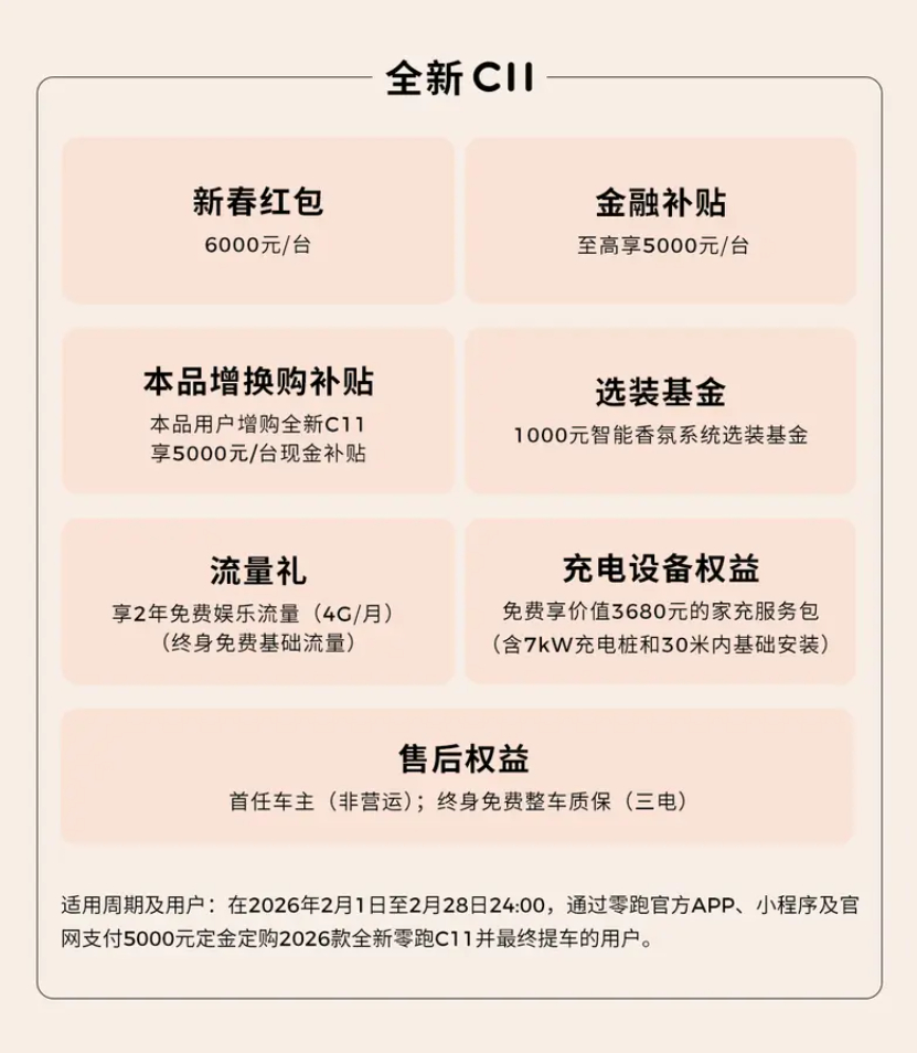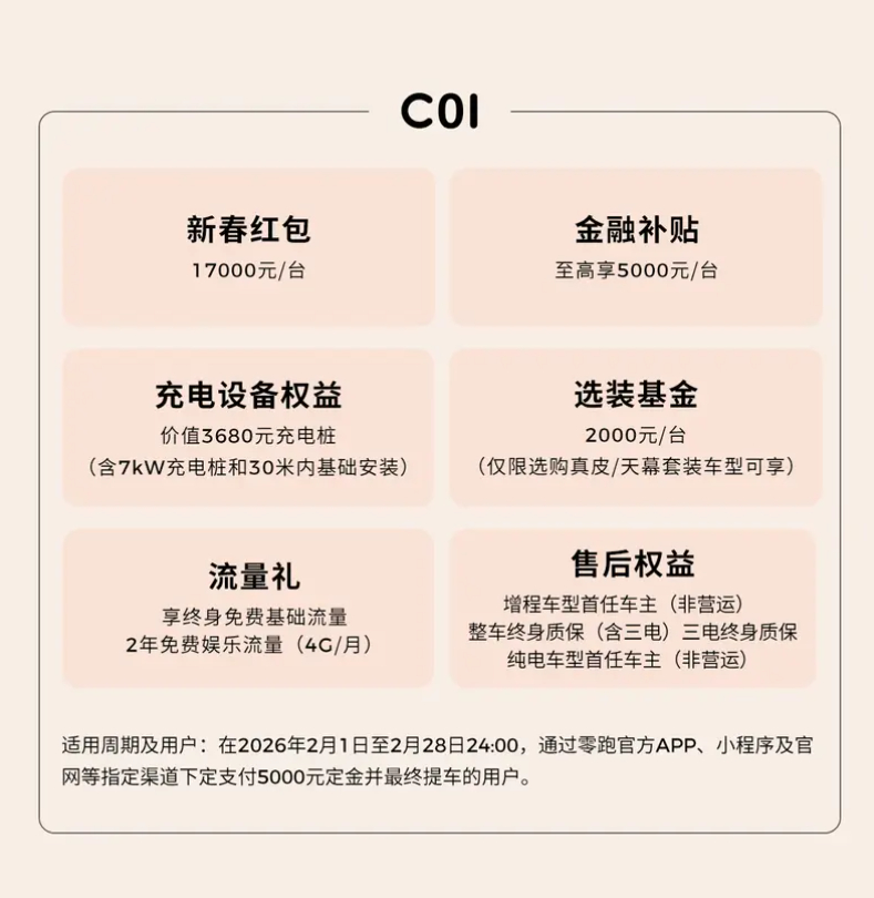 车若初见 零跑推出2月购车权益,可享受新年现金礼:11000元现金优惠;新年老友礼:至高10000能量积分,新年金融礼:至高5年0息。每台车的权益和活动都不一样,正好凑够九宫格,方便春节前后购车的小伙伴参考。
