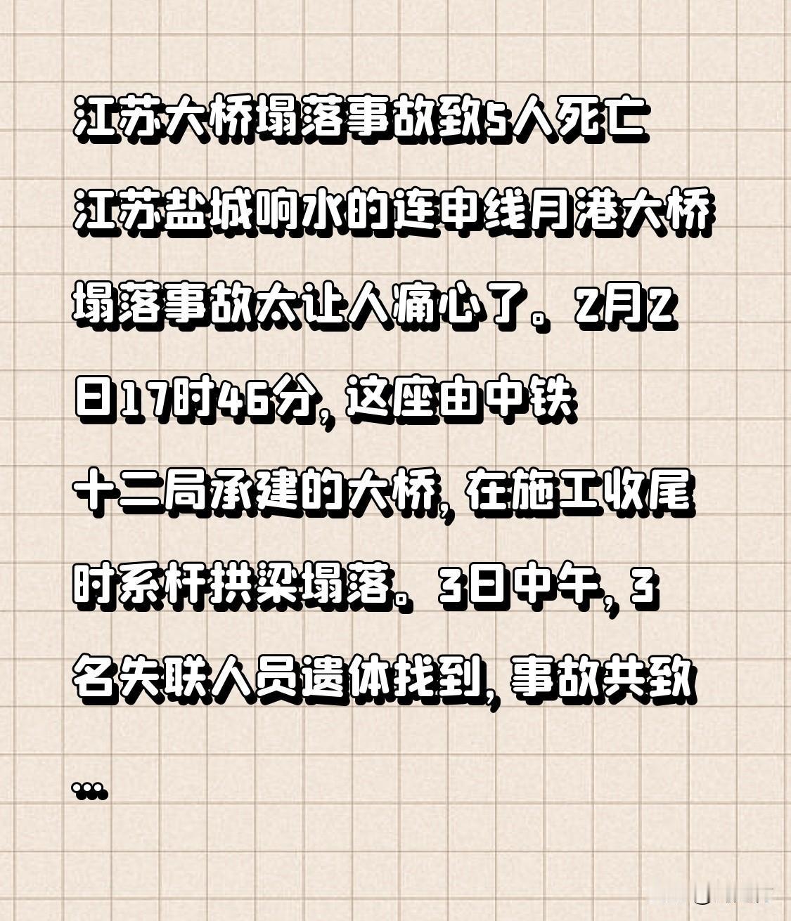 江苏大桥塌落事故致5人死亡 江苏大桥塌落事故致5人死亡 江苏盐城响水的连申线月港大桥塌落事故令人痛心。2月2日17时46分,由中铁十二局承建的该大桥,在施工收尾时系杆拱梁塌落。3日中午,3名失联人员遗体被找到,事故共造成5人死亡。 事发前5小时,有施工人员称打完灰就放假,没想到成了遗言。周边村民在400米外家中都听到巨响,家属焦灼等待,等来的却是噩耗。这项投资超2亿的民生工程,本应是“民心桥”,却因安全问题酿成悲剧。工程安全不容马虎,望吸取教训,避免此类悲剧再次发生。
