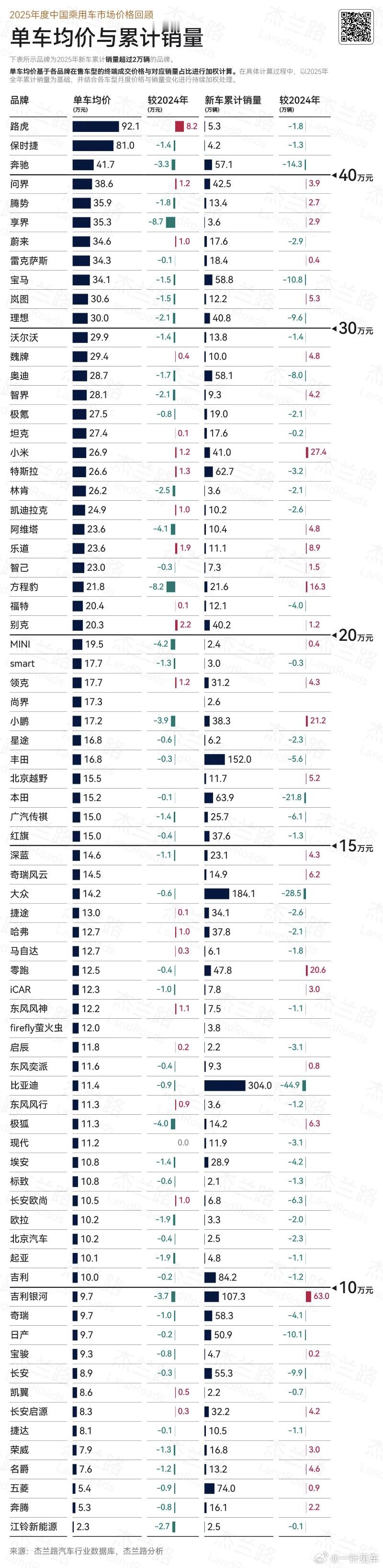杰兰路今日发布2025年年度品牌价格回顾,即便传统豪华品牌算上了进口车,问界也已经超过了BBA中的两个,并且销量超过40万台,均价和销量均同比上涨,实现“量价双升”。技术保持领先,价格体系稳定,保值率和用户满意度高,这才是真正立得住的豪华品牌。 问界汽车