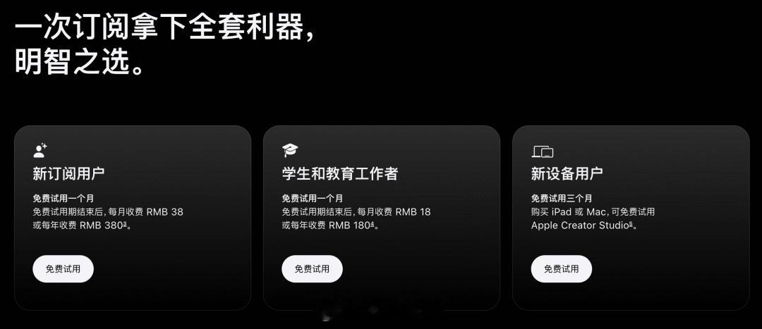 其实这个验证机制在 iPhone 和 iPad 上早就有了,Mac 上貌似不太严格。有需要的直接使用苹果近期推出的 Apple Creator Studio 包含 FCP 在内是个创作者工具,订阅制每月 38 元每年 380 元。
