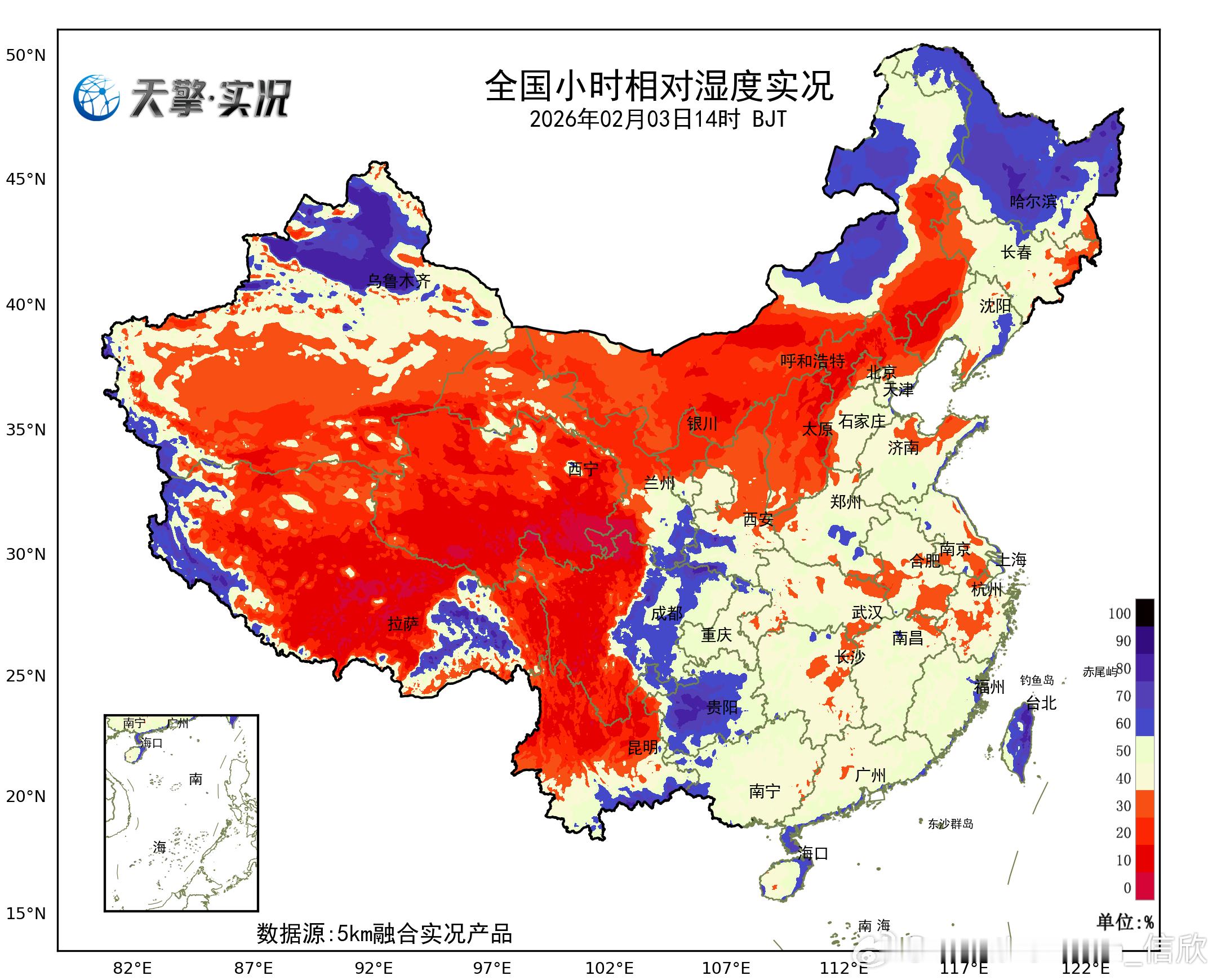 【降水和干燥】今天08-14时,我国降水不多,主要出现在贵州。今天下午,青藏高原到内蒙古、辽宁西部等地,空气干燥,多地相对湿度不足20%,比如辽宁朝阳15%、西藏拉萨5%、拉孜4%。今天下午到明天中午,新疆北部、青藏高原的降雪可能会有所增多。贵州海南等地还有弱降雨。