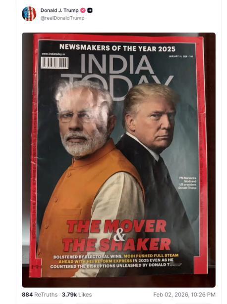 在美印贸易协议达成后,特朗普转发了一张《今日印度》的封面,称赞两人都是伟大的变革者。 大家都知道了美印达成了贸易协议,但这份协议对印度来说并不算优待,不仅关税没有降到跟其它国家一样的15%而是18%,还得向美国采购价值5000亿美元的商品,同时还得逐步对美国开放市场。 这对莫迪来说怎么受得了,怎么像国内交代,于是特朗普很识趣的递来了梯子,他转发了一张《今日印度》的封面,封面上两人被称为2025年度伟大的变革者,而且还是莫迪在前特朗普在后,这情绪价值给的很满。 两人不愧为“赢学”大师,莫迪既然送上大礼,特朗普必须吹捧一番,这俨然一副“双赢”的局面。