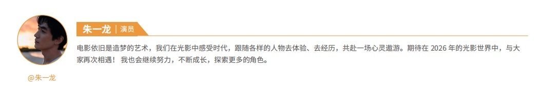“电影依旧是造梦的艺术,我们在光影中感受时代,跟随各样的人物去体验、去经历,共赴一场心灵遨游。期待在2026年的光影世界中,与大家再次相遇! 我也会继续努力,不断成长,探索更多的角色。”2026期待电影《空枪》!朱一龙说电影依旧是造梦的艺术朱一龙寄语