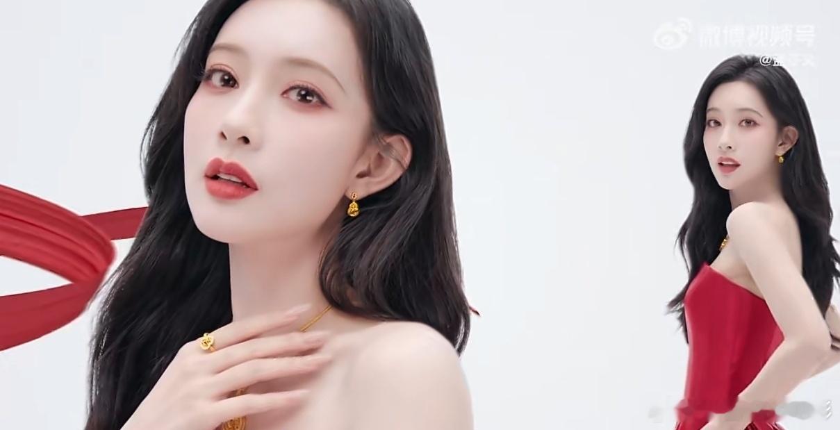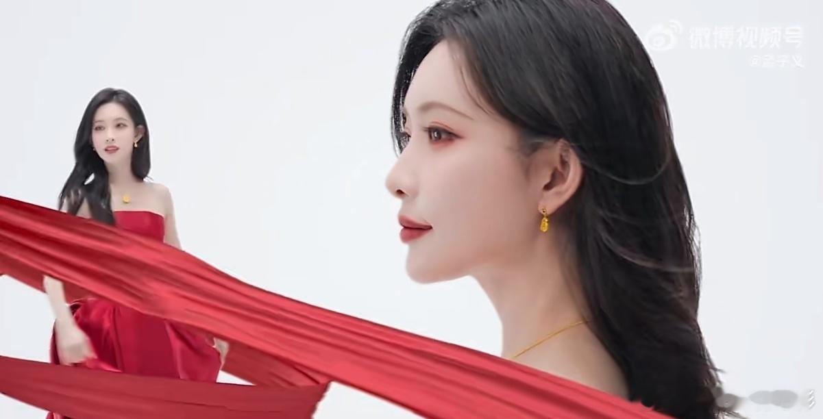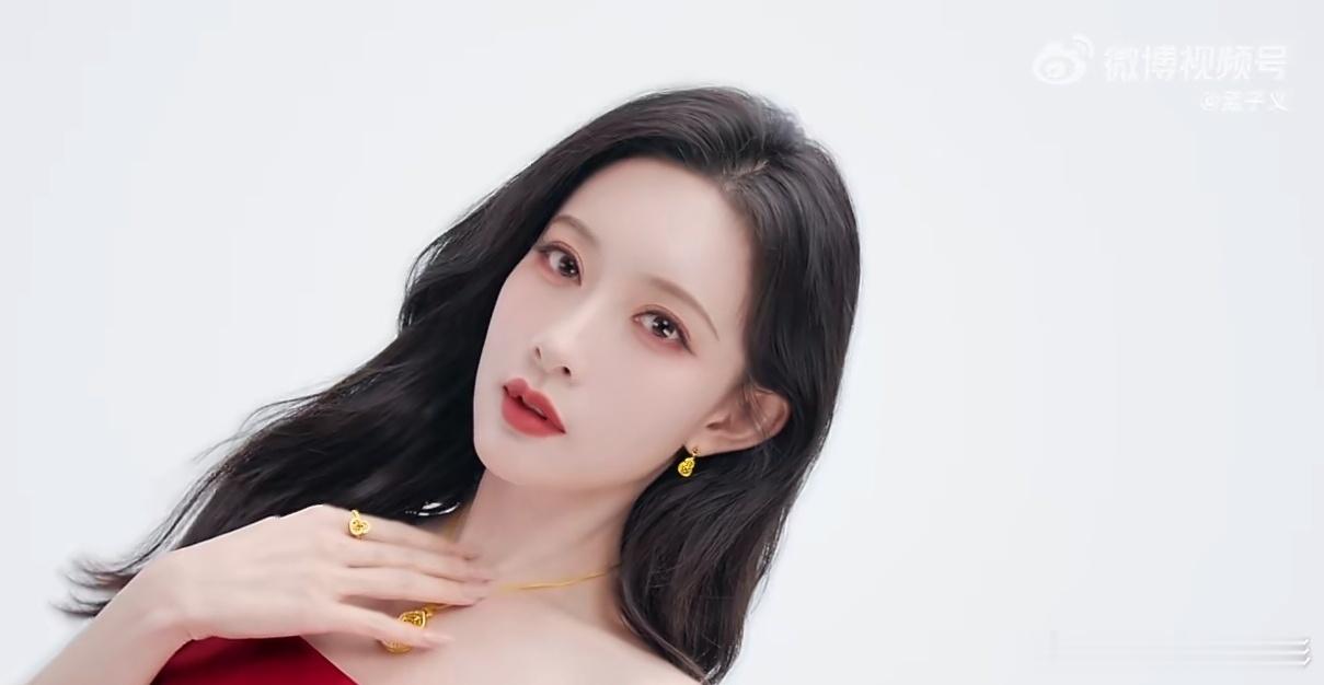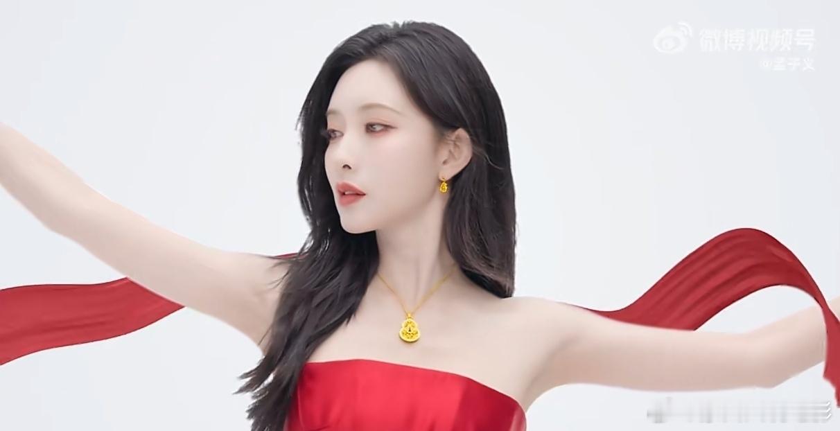 孟子义身着正红礼裙,波浪长发如鎏金流淌,颈间、腕间点缀的梦金园「好运交织」系列金饰,将中式典雅与现代灵动诠释得恰到好处。她的率性温柔与金饰的精致相得益彰,每一帧都传递着"把梦织进新年"的美好愿景。