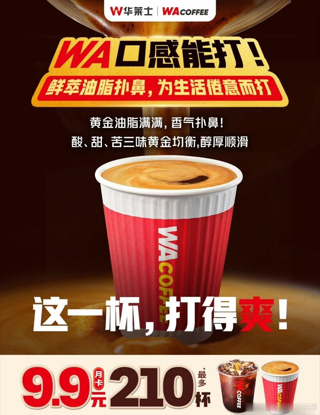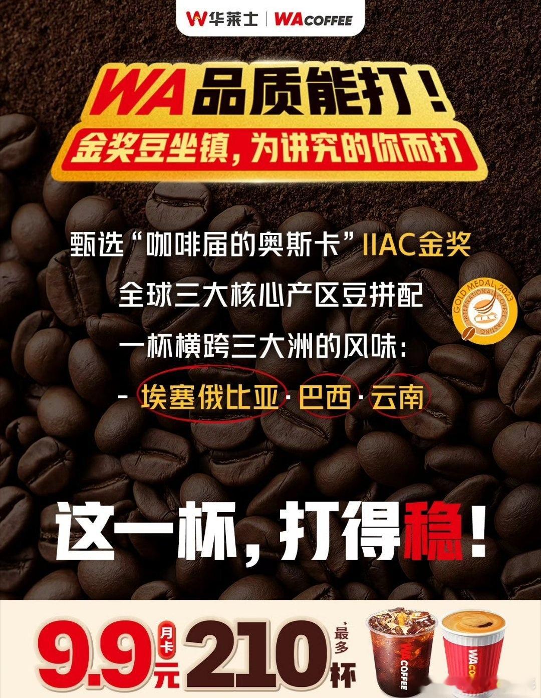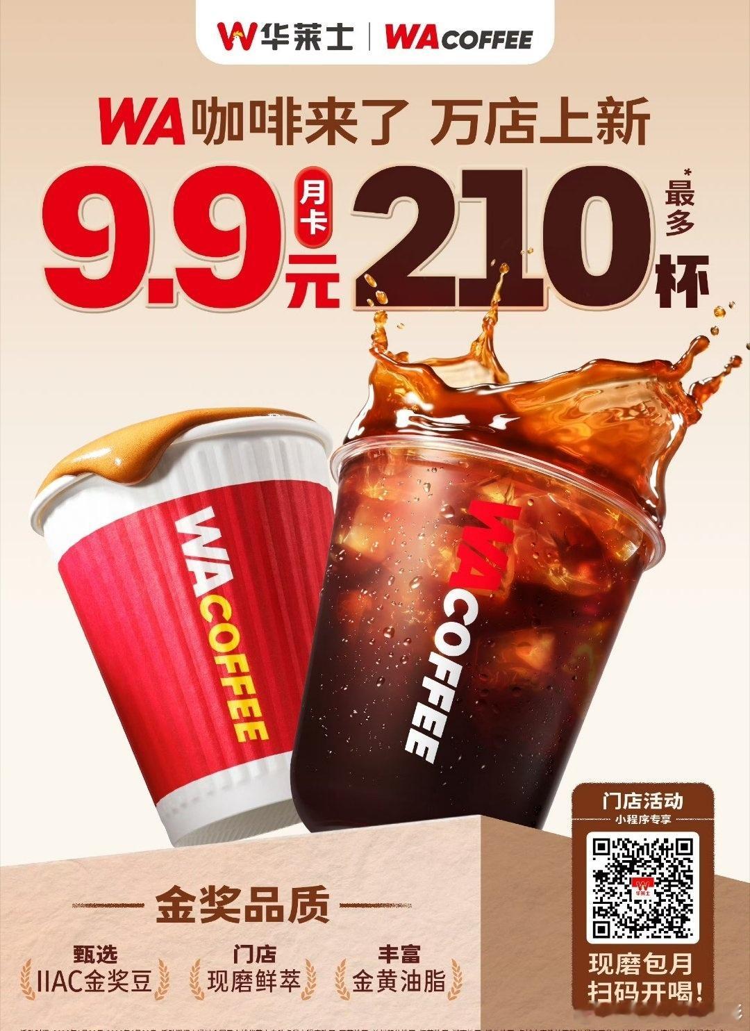 WA咖啡选用IIAC金奖咖啡豆,融合埃塞俄比亚、巴西、云南三大产区风味,现磨鲜萃,油脂金黄。美式坚果香浓,拿铁绵密顺滑。更惊喜的是价格——9.9元月卡享一整月咖啡自由,开卡一杯回本,打工人、学生党轻松实现咖啡自由。