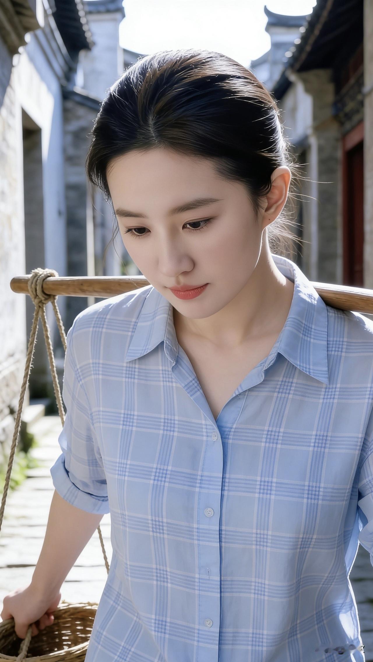 浅蓝格纹衬衫的衣料在晴日里泛着清爽的光泽,她挑着竹篮走在徽派古巷的石板路上,目光落在脚下的青苔石阶。白墙黛瓦在光影里错落,风穿过巷弄带着老墙的沉静,混着竹篮里草木的清香,把整个古巷都烘得温润又松弛。 我们总在城市的快节奏里步履匆匆,却忘了在这样的老巷里,挑着担子慢走的时刻,就是最踏实的生活。她低头前行的样子,像在提醒我们:不必追赶远方的热闹,身边的烟火气就藏着最本真的温柔。 你有多久没有像这样,在老巷里慢悠悠地走一走了? 淡绿色衬衫 浅蓝衬衫穿搭 气质格纹衬衫 青色衬衫 浅蓝格子衬衫 淡风衬衫 浅蓝麻衬衫