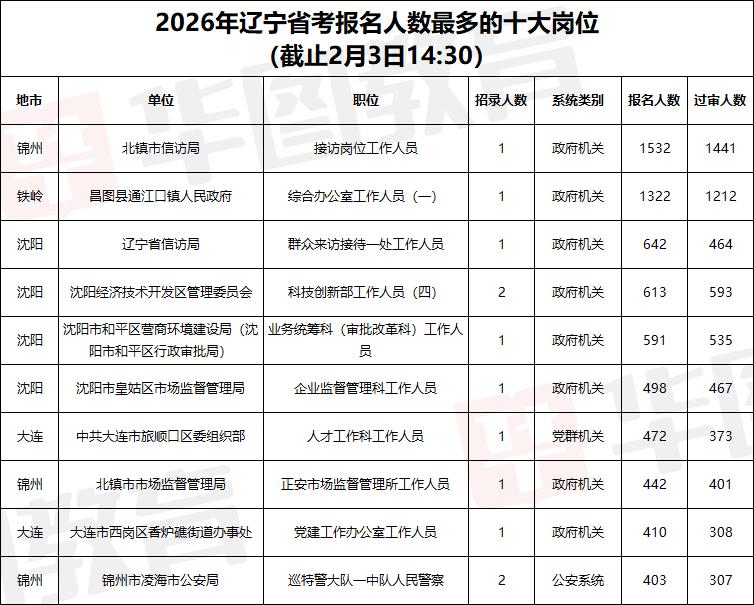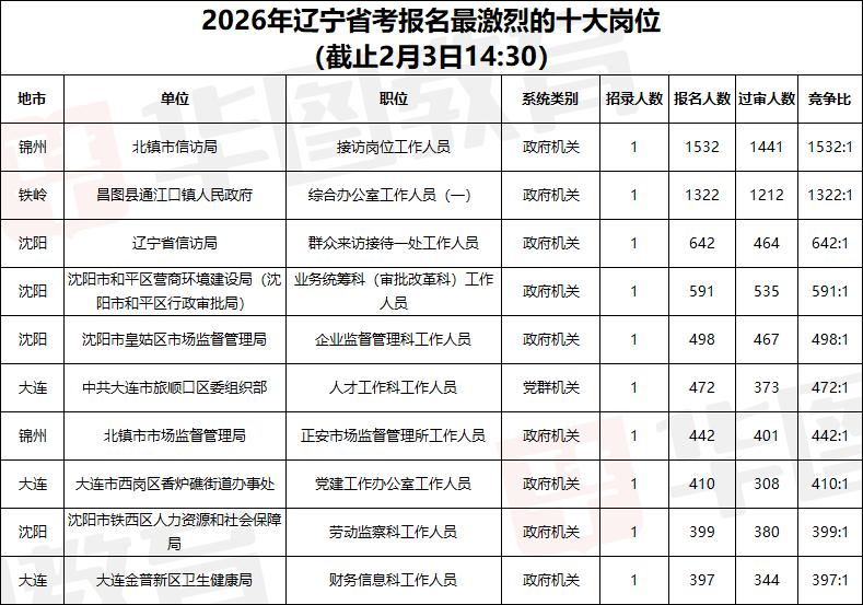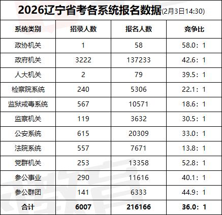 🔥2026 辽宁省考报名数据出炉!这些岗卷疯了! 截止 2 月 3 日 14:30,辽宁省考总报名人数破 21.6 万!平均竞争比 36:1,招录 6007 人,考公 er 们太拼了💪 ✅ 地市战况: 沈阳以 51.2:1 竞争比登顶,大连 45.9:1 紧随其后,朝阳、锦州报名人数也突破 1.7 万,卷度拉满! ✅ 系统热度: 党群机关竞争比 52.8:1、政协机关 58:1(虽仅招 1 人),政府机关报名人数 13.7 万成 “流量担当”。 ✅ 神仙打架岗: 北镇市信访局接待岗以 1532:1 竞争比封神!昌图县通江口镇政府岗 1322:1 紧随其后,这些岗堪称 “千军万马过独木桥”,报了的勇士请举手🙋♂️ 你的岗位战况如何?评论区聊聊,看看谁才是天选考公人!👇