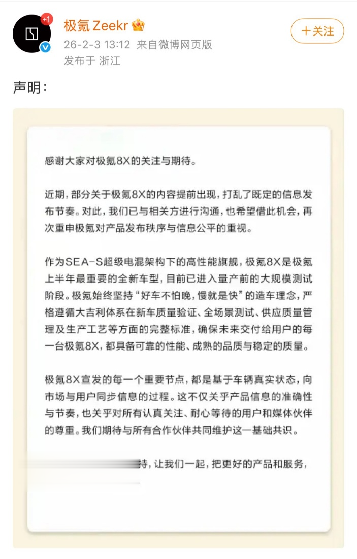 首先,该声明感谢了媒体与公众的关注,表示部分关于极氪8X的内容提前出现,打乱了既定的信息发布节奏。对此,极氪已与相关方进行沟通处置,也希望借此机会,再次重申对产品发布秩序与信息公平的重视。