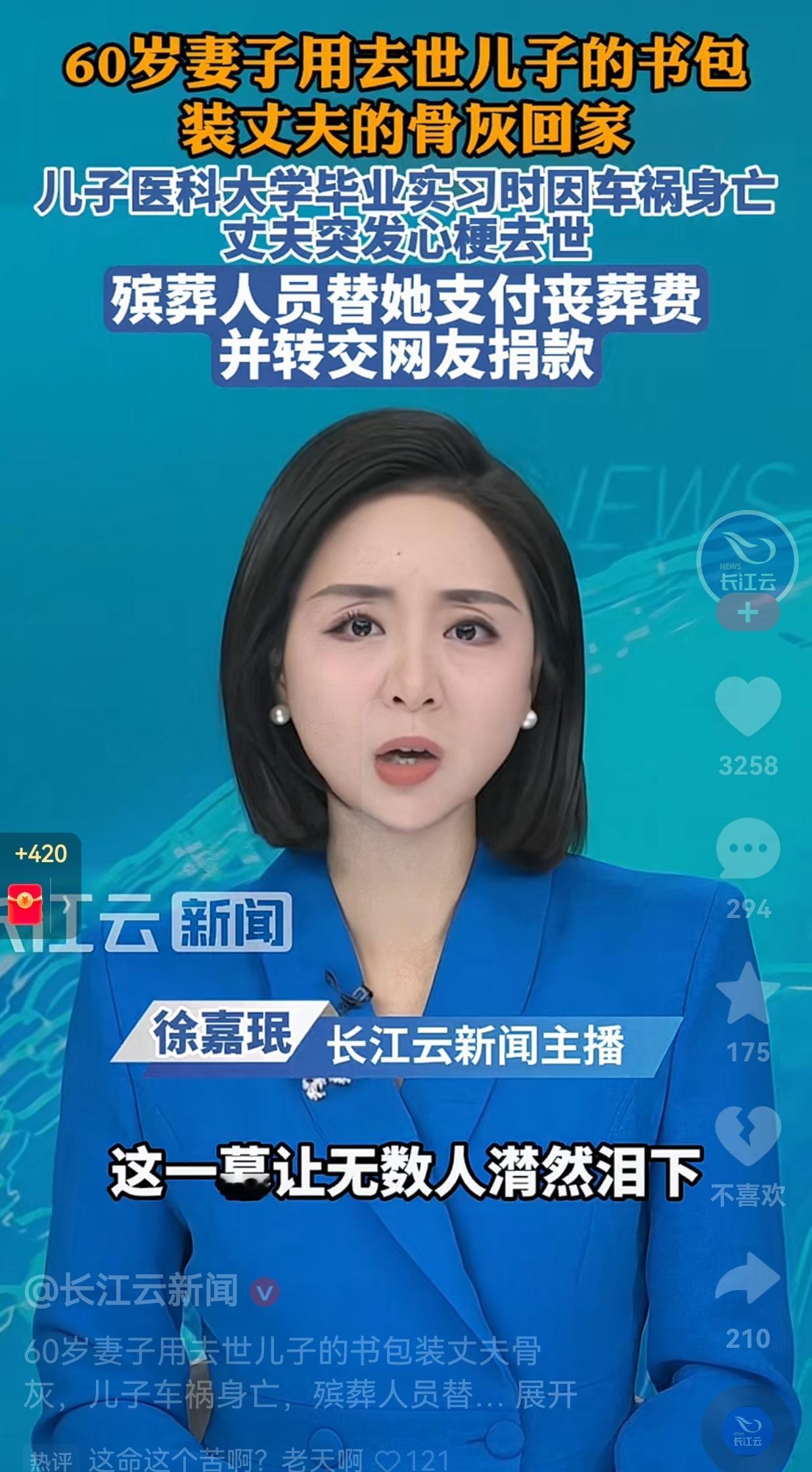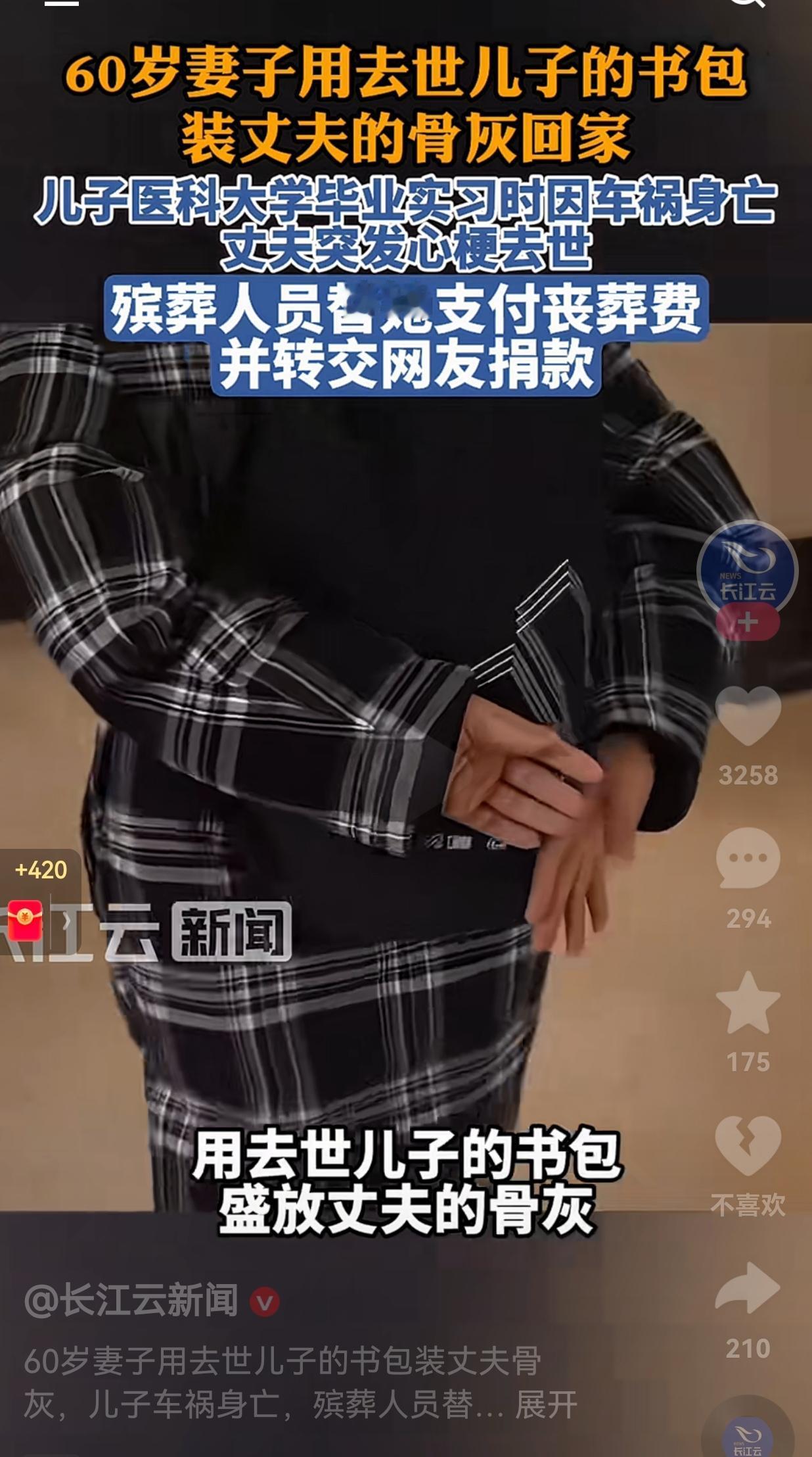 阿姨的命运也太苦了!先是儿子离世,又是丈夫先一步走了,现在形单影只,一个人孤独地度日,想想都心疼!我只能说,老天爷呐!你真的是不长眼呀! 辽宁大连一位60岁的阿姨和丈夫是从小一起长大的邻居,也是青梅竹马的爱人,阿姨一辈子都称呼自己的爱人为“哥哥”,更是别人眼中模范夫妻。 据阿姨讲述,他们俩都是独生子女,她跟丈夫过了大半辈子了,从来没有吵过架,更没有红过一次脸。 可能是老天爷太羡慕她的生活了。因此,命运偏要跟她开最残忍的玩笑:五年前,他们变卖家产供出来的医科大学儿子,本以为儿子大学毕业,自己就能享福了。 谁能想到,儿子在去医院实习的路上就出车祸走了。 如今,相依为命的丈夫又突发心梗,连句再见都没留下。 本来老两口计划着等到来年开春回农村养老,过几天安稳日子,谁能想到竟发生这种事情。 丈夫去世后,阿姨翻遍了家,没找到像样的装骨灰的东西,最后拿起了儿子生前的书包。 殡仪馆的工作人员得知她的遭遇后,心疼得红了眼眶,不仅自掏腰包替她垫付了丧葬费,还用视频记录下全过程发到网上,引来无数热心网友捐款。 如今这些钱已经全部交到阿姨手里,足够支撑她接下来一段时间的生活。 在殡仪馆里阿姨坐在长椅上,搂着丈夫的骨灰,被工作人员轻轻扶着,哽咽着一遍遍地呼喊:“哥……哥哥你不是说你最爱我吗?这世界上,你留下我一个人,我怎么办?” 网友看到后评论说:“这书包里装的是她的全世界啊。”是啊,一个书包,装着她的儿子,她的丈夫,她的后半生。如今她在这世上,已经没有一个亲人了。 我们总说“来日方长”,可有时候,人生真的充满意外,甚至来不及做最后的告别。 所以说,我们别等以后,别说来日方长,想见的人赶紧见,想做的事情赶紧做,千万别因为来日方长的言辞,让自己留下终身的遗憾。 针对此事,你有什么看法呢?欢迎大家评论区讨论留言。
