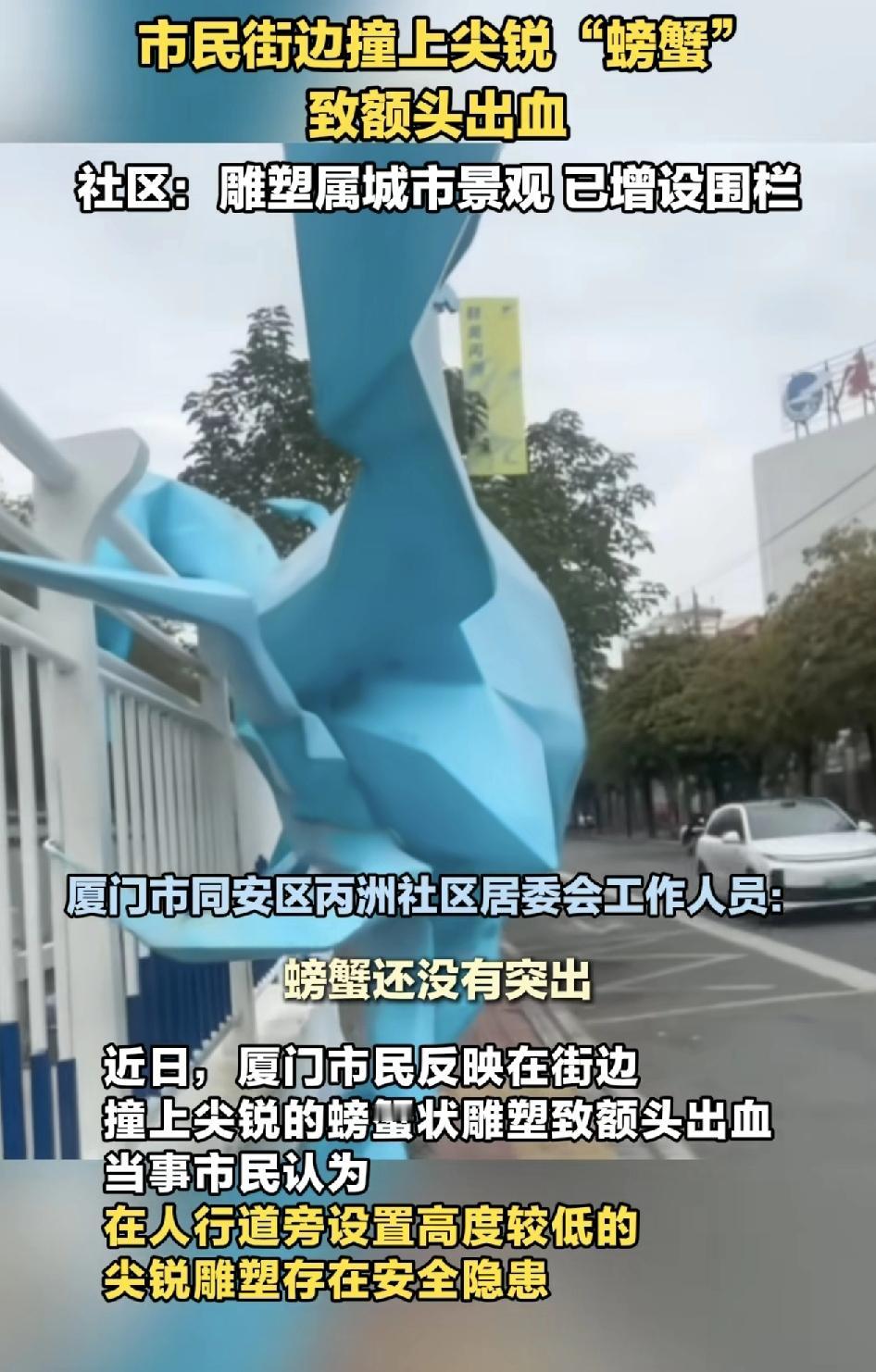 厦门市区的一位网友发视频称经过街到某一个螃蟹状的景观时,被裸露出来的尖锐处刺破了额头,额头流了血。街道工作人员称该。雕塑为城市景观,裸露的地方并没有延伸到马道那边去,现在已经用围栏围了起来。始名为该尖锐的景观设置的高度太低不合理。