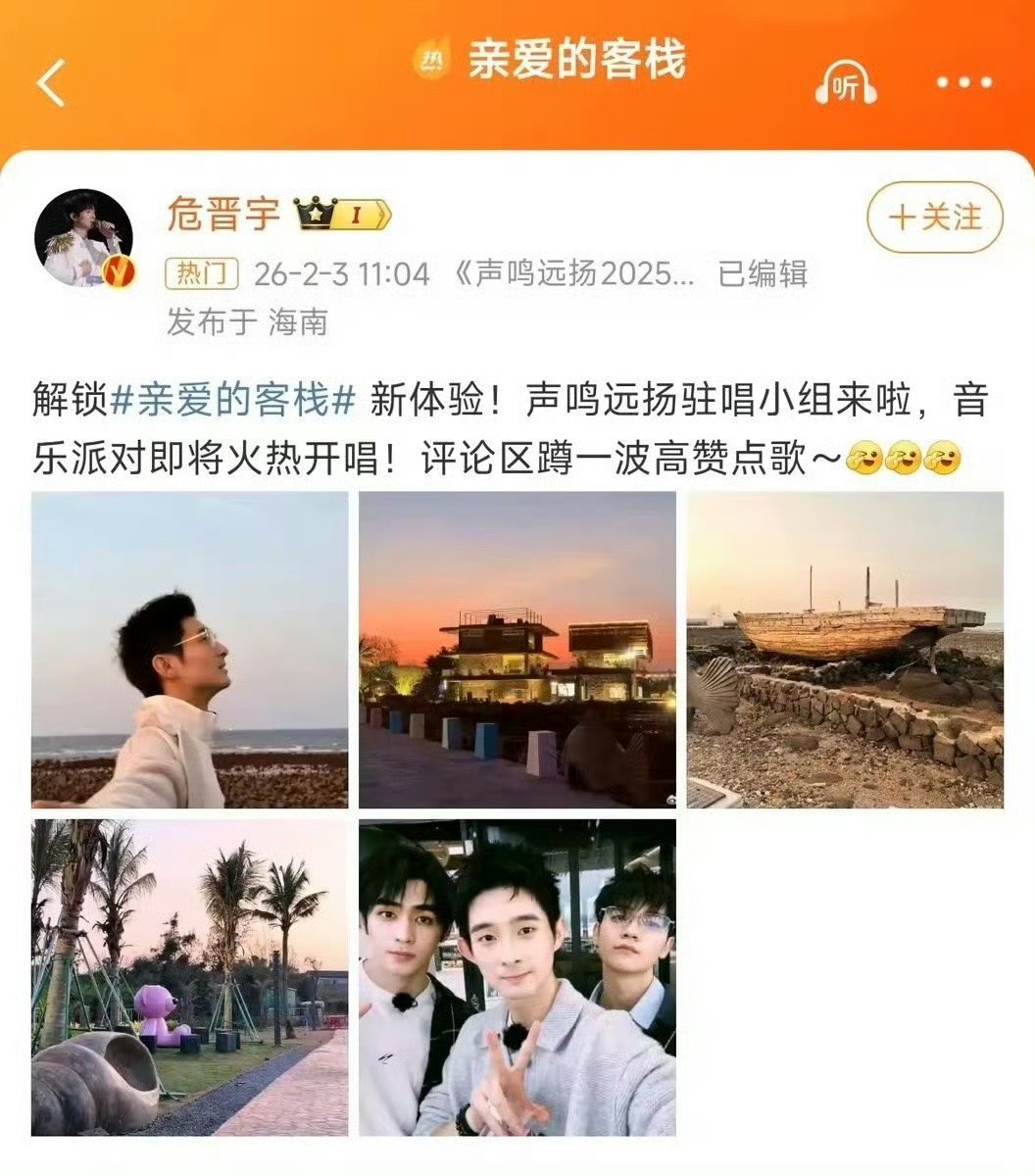 声鸣远扬全国三强亲爱的客栈路透 声鸣远扬要去亲爱的客栈了,期待节目播出!亲爱的客