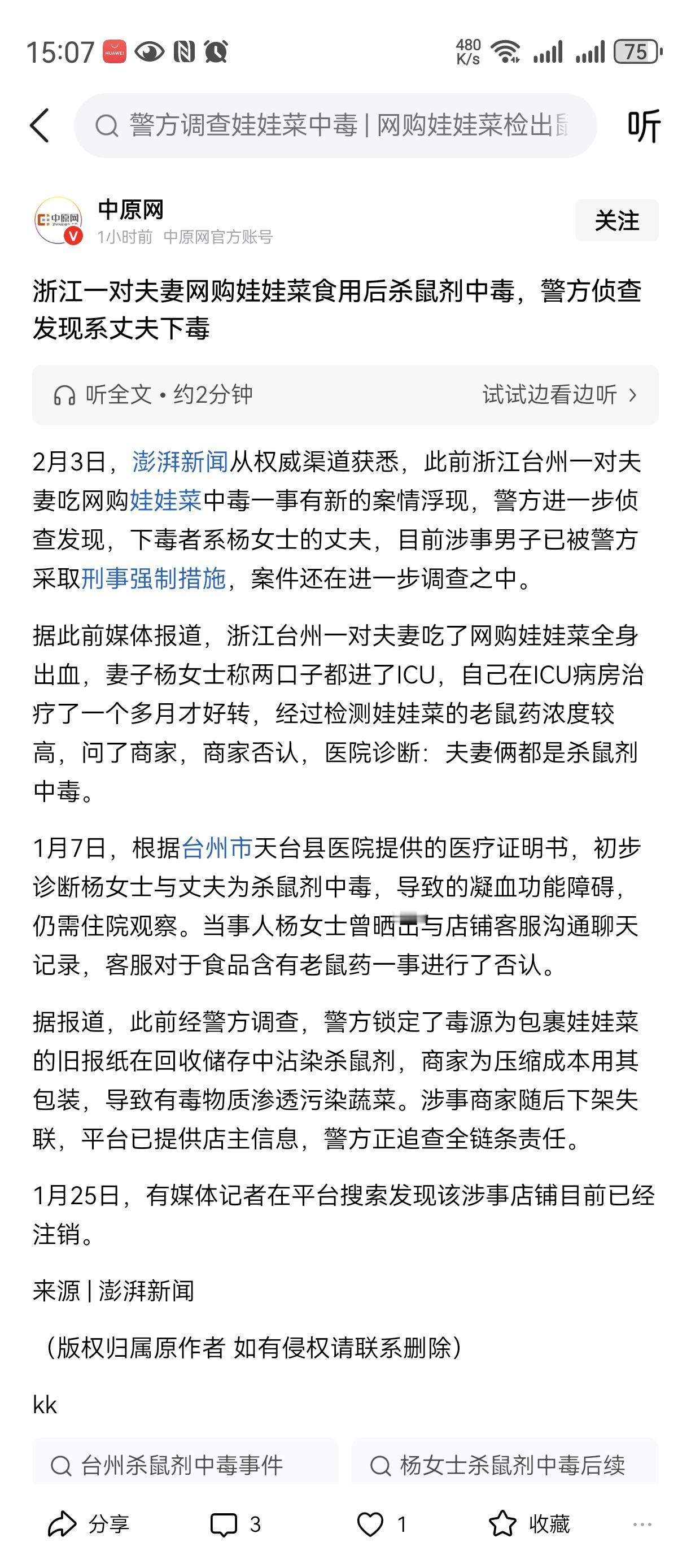 夫妻本是同林鸟?[捂脸] 浙江这个丈夫, 自己下老鼠药, 确让商家背锅, 得出一个包装纸买娃娃菜有毒的伪结论! 如今查明就是这个毒丈夫要杀妻子, 是不是没有孩子!老鼠药中毒 这就是人性的泯灭!