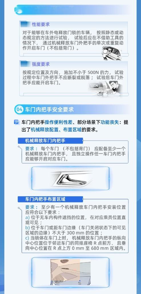 汽车门把手安全强制性国家标准发布千呼万唤始出来!汽车门把手的强制性国标终于落地了,一图看懂是怎么个事儿。划重点:这不是建议,是强制!内外必须配机械把手,安全底线焊死了,专治那些为了颜值不顾安全的设计。新规明年1月1日起执行,半隐藏式只要达标就OK,大家不用慌!