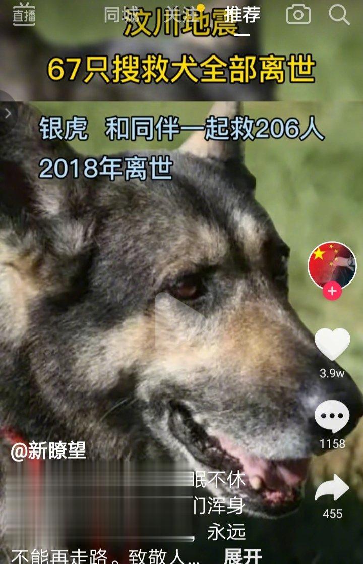 汶川地震中67只警犬已全部离世!银虎,沈虎,冰洁和它们的同伴在汶川地震中一起救出了206人!它们连续多日不眠不休的高强度搜救,任务结束后都暴瘦十几斤,心肺功能大大下降,咳嗽不止,甚至导致腿部残疾,走路一瘸一拐,它们为人类付出了巨大的代价!它们在成为搜救犬之前都是人们眼中的普通犬只,只是经过难以想象的高难度训练才成为优秀的搜救犬!上万年来它们从未抛弃过人类!可我们又对它们做了什么?!