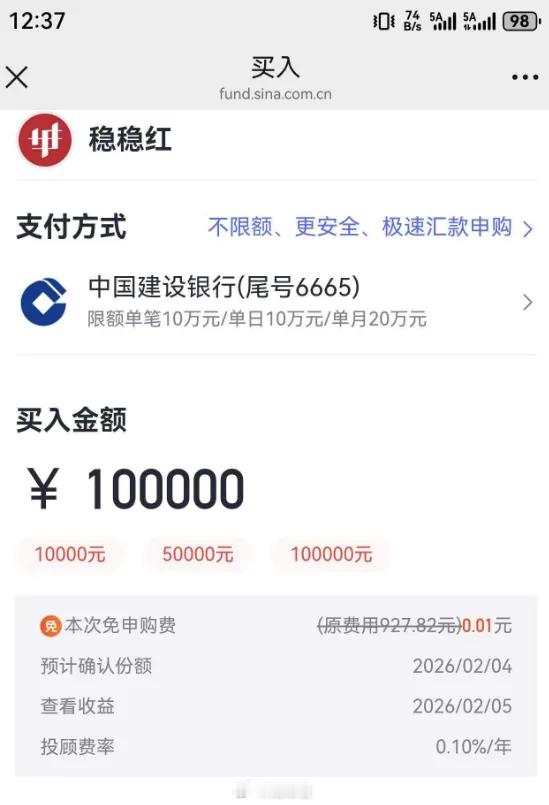 我自己今天也是首次买入稳稳红,我先买10万(建行单日限额10万),现在申购费几乎是全免。