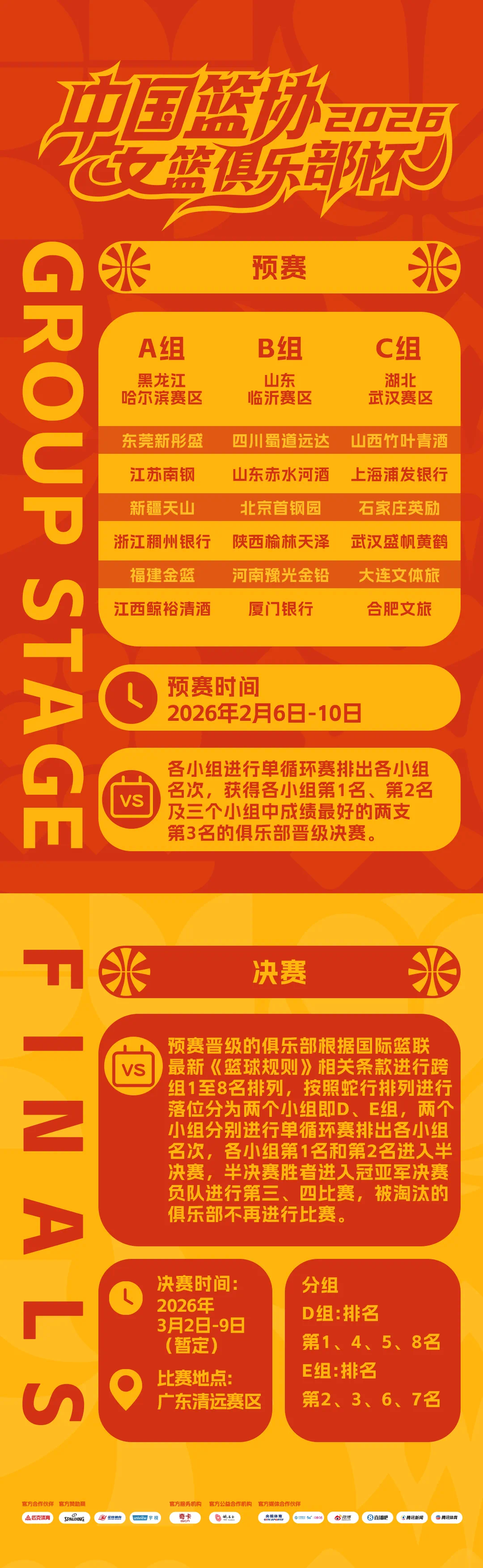 2026年中国篮协女篮俱乐部杯将于2月6日正式开赛。第一阶段于2月6日至10日进行,赛区设在黑龙江哈尔滨、山东临沂和湖北武汉;第二阶段拟于3月2日至9日在广东清远举行。本次赛事共有18支俱乐部参赛,具体赛制及分组情况如下: