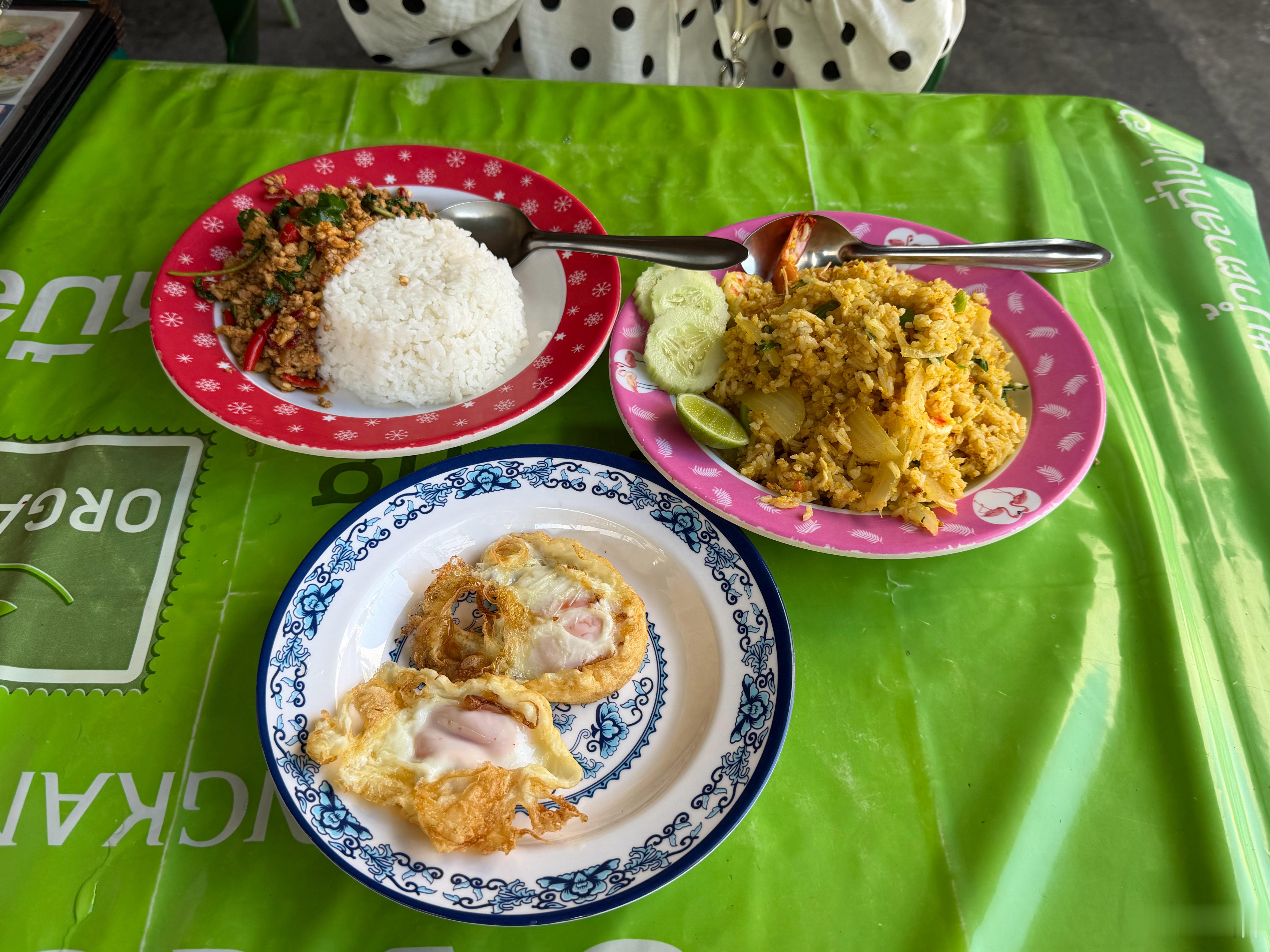 泰国第一餐,找家路边的小馆子,两份饭加两颗饭,人民币 28 块钱。打抛饭味道还行,就是老板娘看我两被辣哭了笑到不行 虽然我俩英文泰语双废,但完全不影响消费…