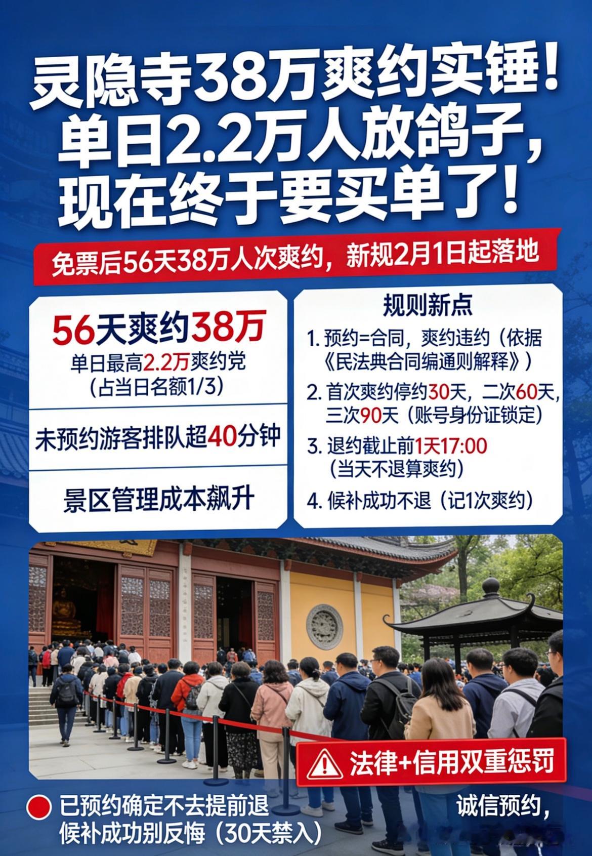 灵隐寺对38万爽约者出手了预约一方面是为了控制人流量,避免人太多,而免票是福利,