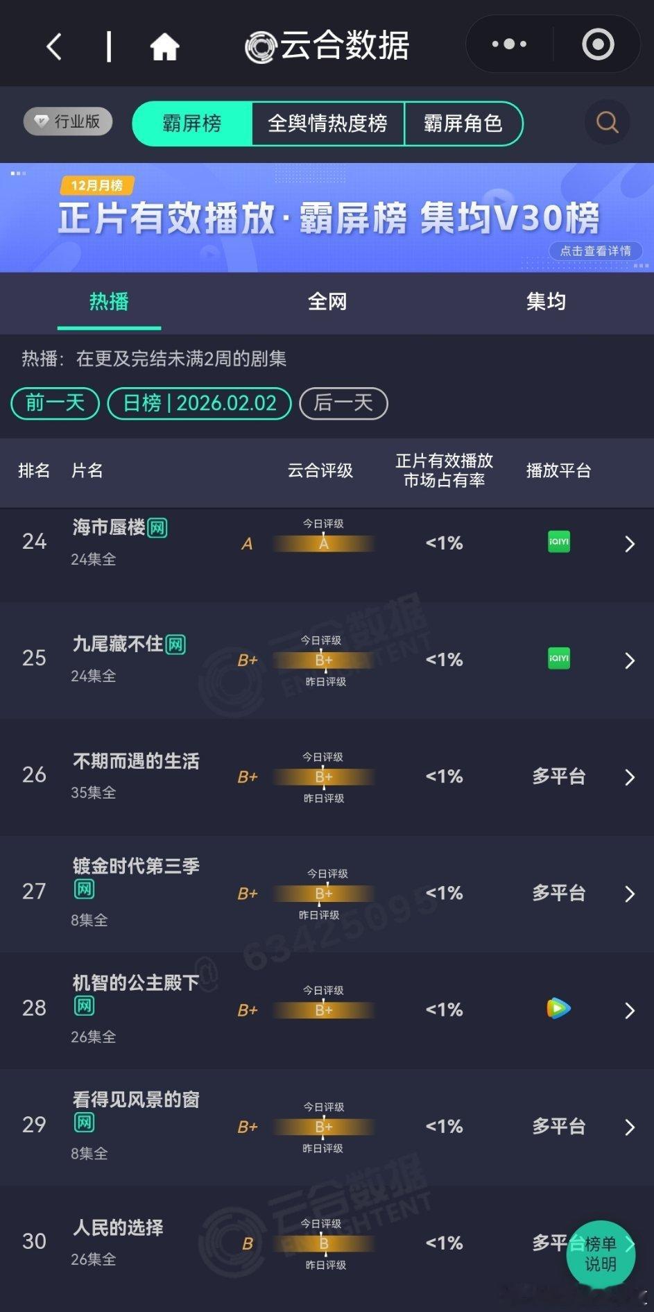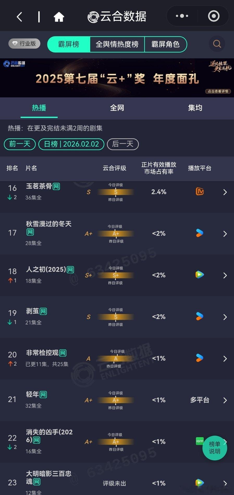 2月2日云合播放占比云合 太平年15.1%生命树10.2%生命树 破10了,生命树的热度很干,所以播放量对应的热度数据也是实打实的。夜色正浓8.3%评级大幅上升到S了。有罪之身7.1%年少有为6.7%也横盘了女神蒙上眼4.5%评级上升。