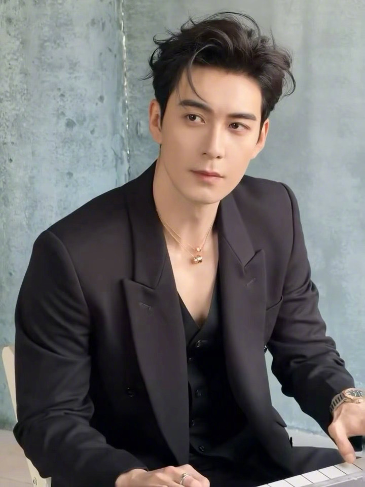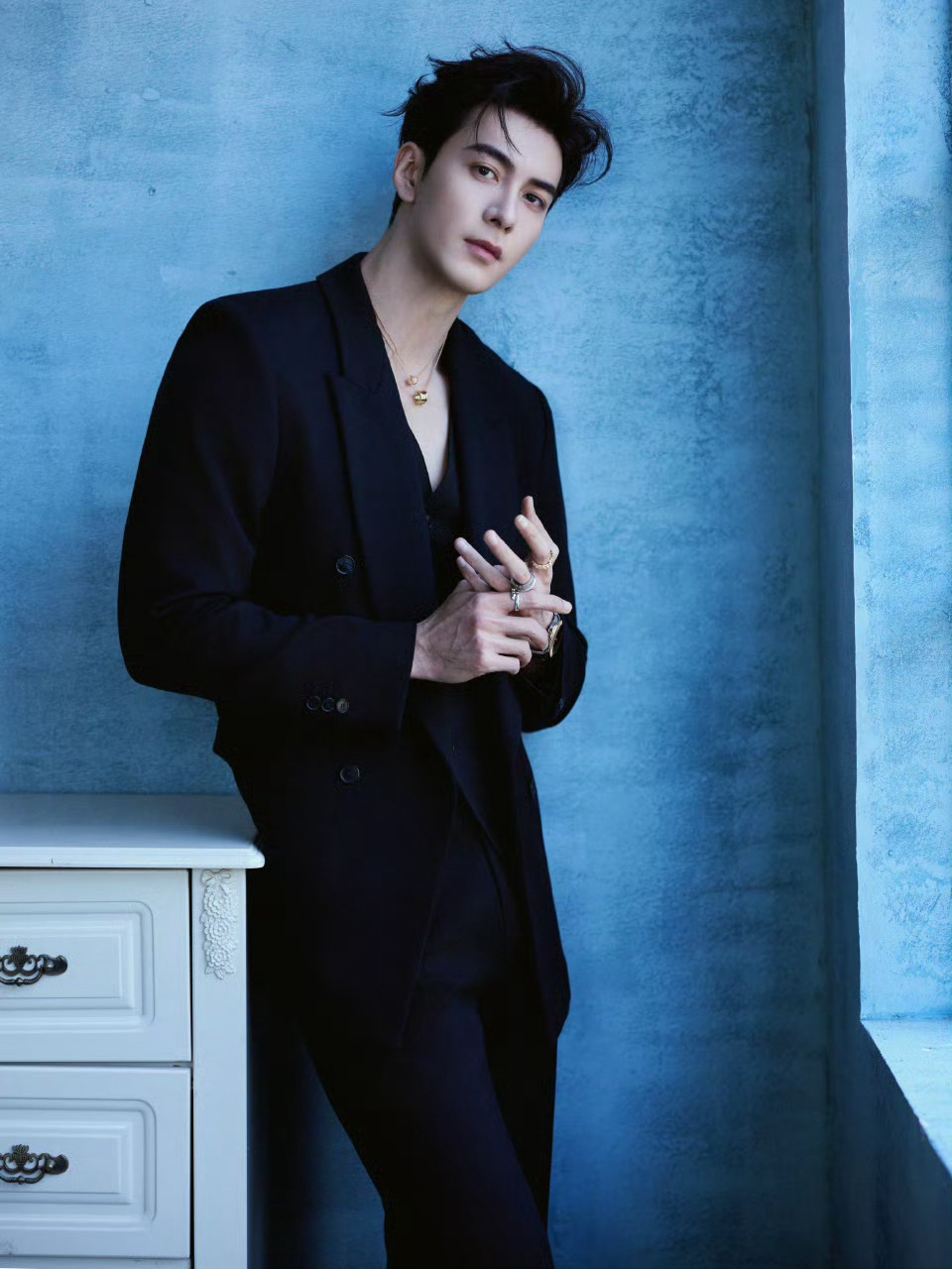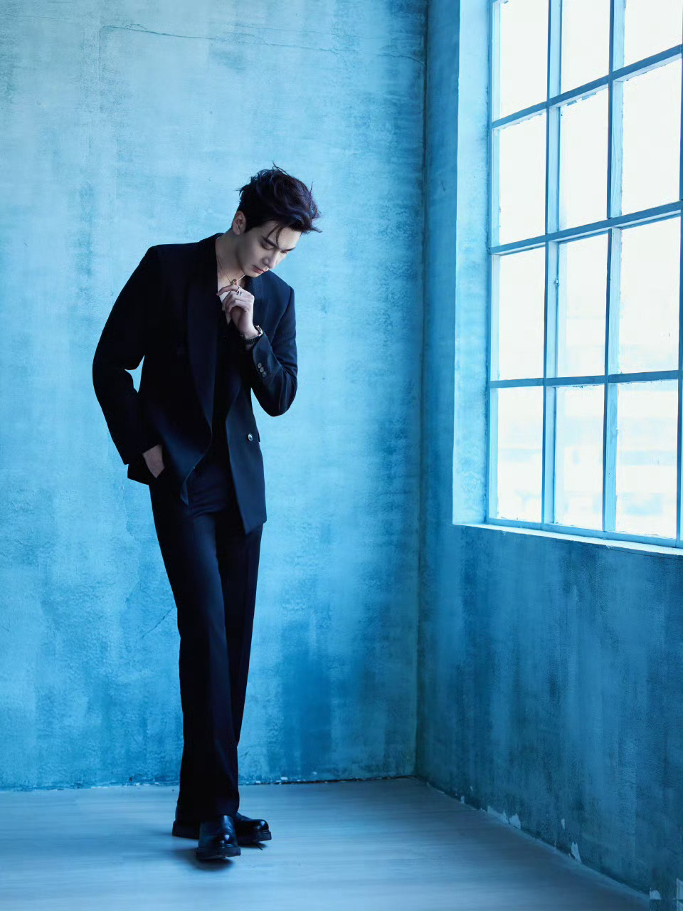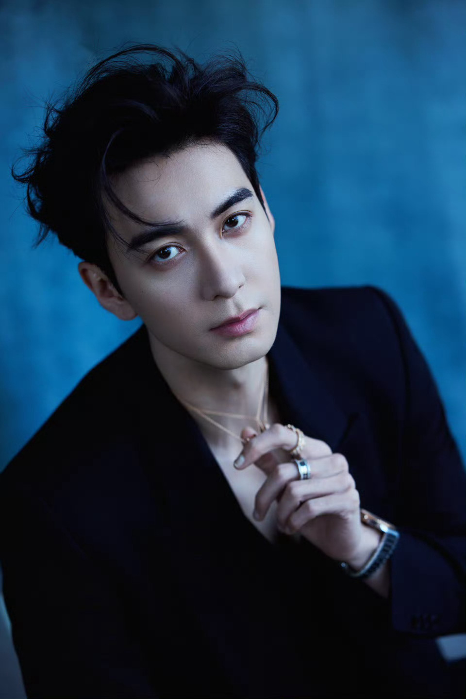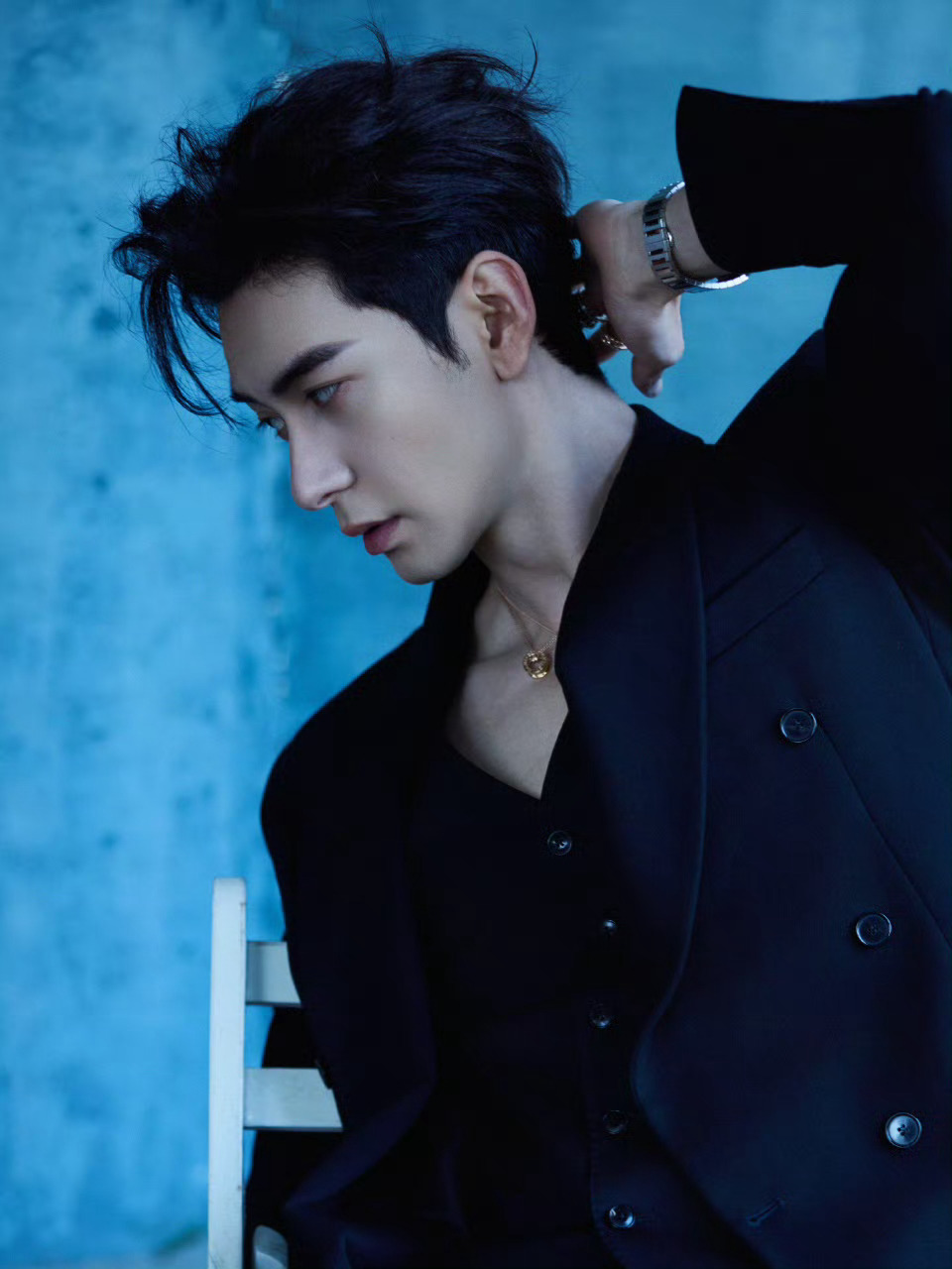 陈星旭 in BVLGAR 💙🖤💙 新造型大片,深V的西服套装,佩戴着宝